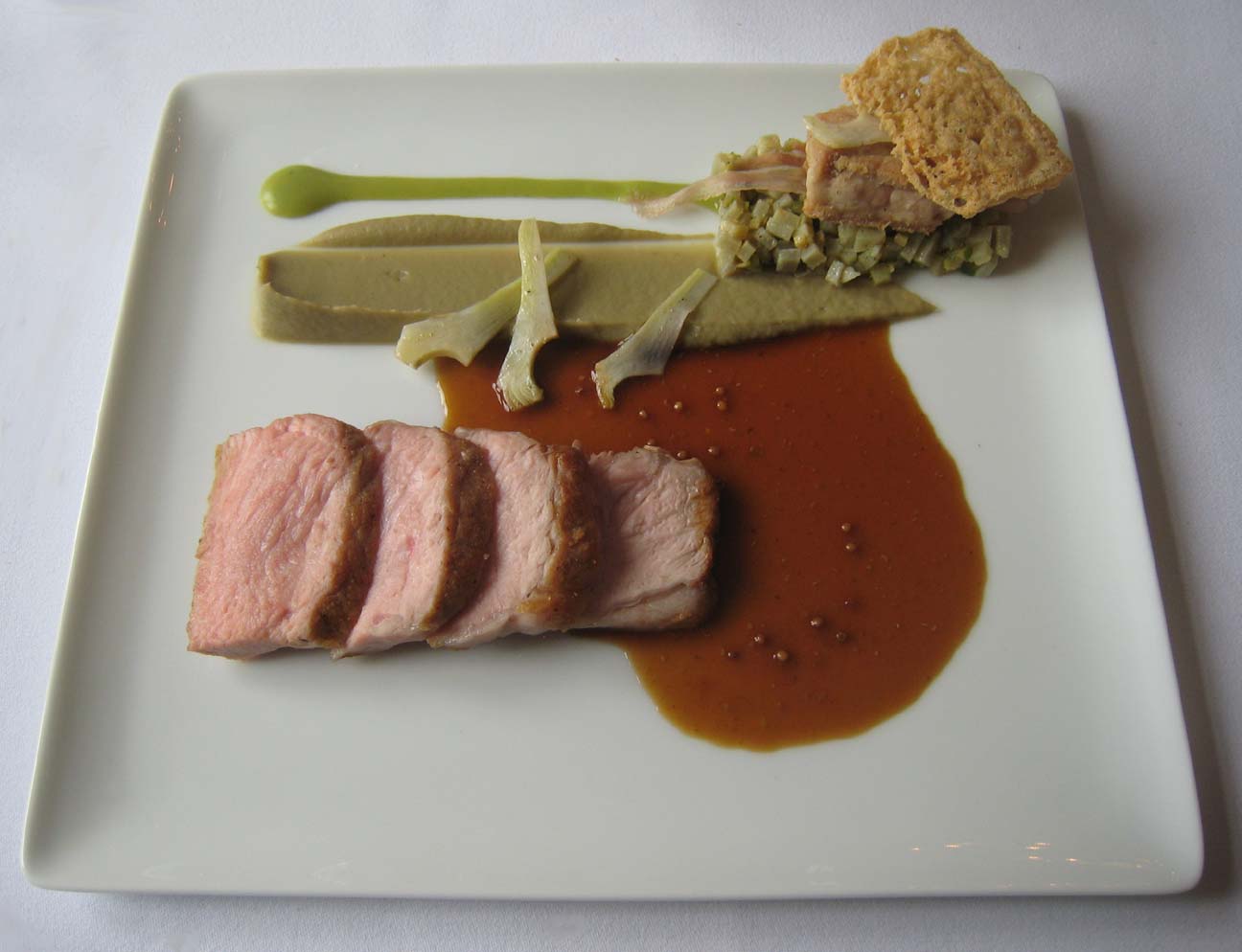 Donald's dish: veal breast, confit, sweetbreads, cardamon, green olives and artichoke. This was the first time we have had sweetbreads. They were veal sweetbreads, which are deemed the best, "prized by gourmets throughout the world" . For those of you who are not familiar with sweetbreads, they are thymus glands. By the way….I had one and half glasses of wine at this point, so yes, I did taste! And we both thought they were delicious.