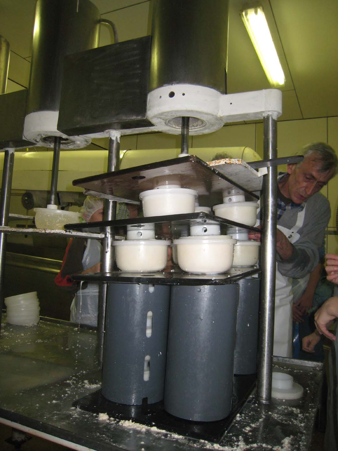 and flipped it over and put back into the form upside- down. This was the final step to "making" the cheese. It is ready to be placed in the industrial strength cheese-press.