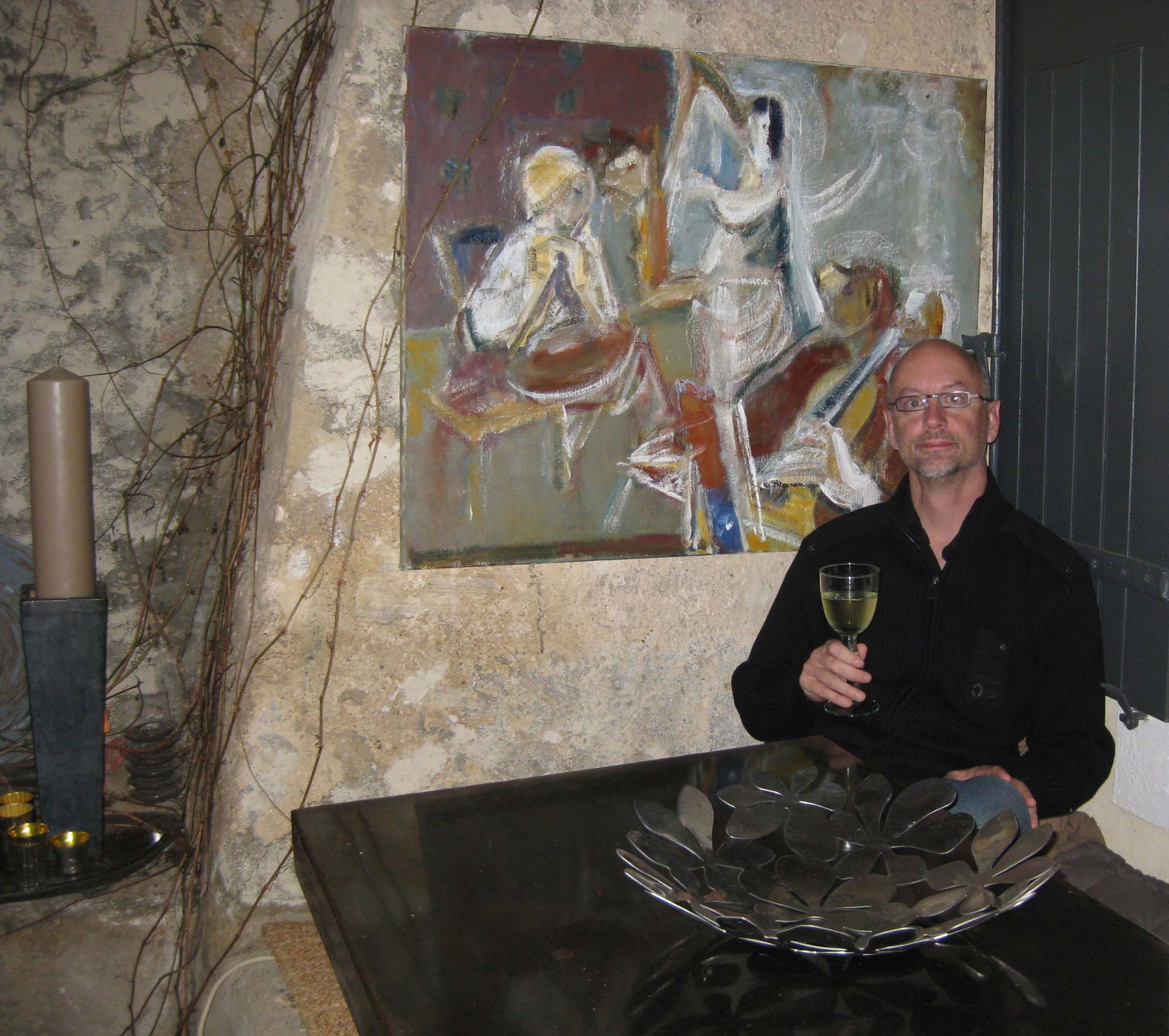 This was taken in their outdoor courtyard.  Look closely on the back wall, you can see where Natasa  hung original paintings outside.
