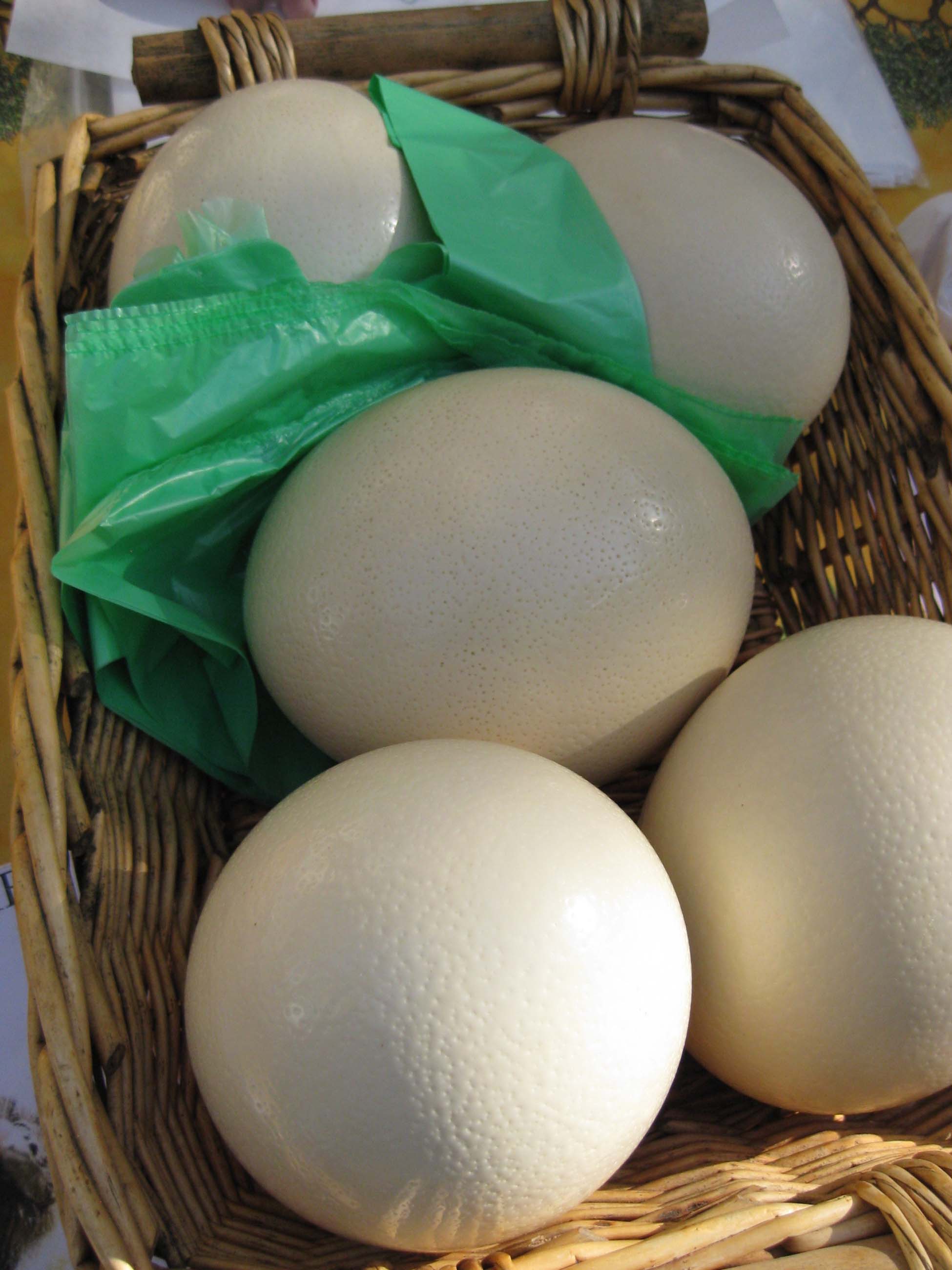 Ostrich eggs!  They were huge.  I had to research this one and found that the ostrich lays the largest eggs of any living bird.  It weighs around 3 lbs and is equivalent to 18 to 24 chicken eggs.  The female lays 15 to 60 eggs but they have a very low survival rate, usually only one per nest.
