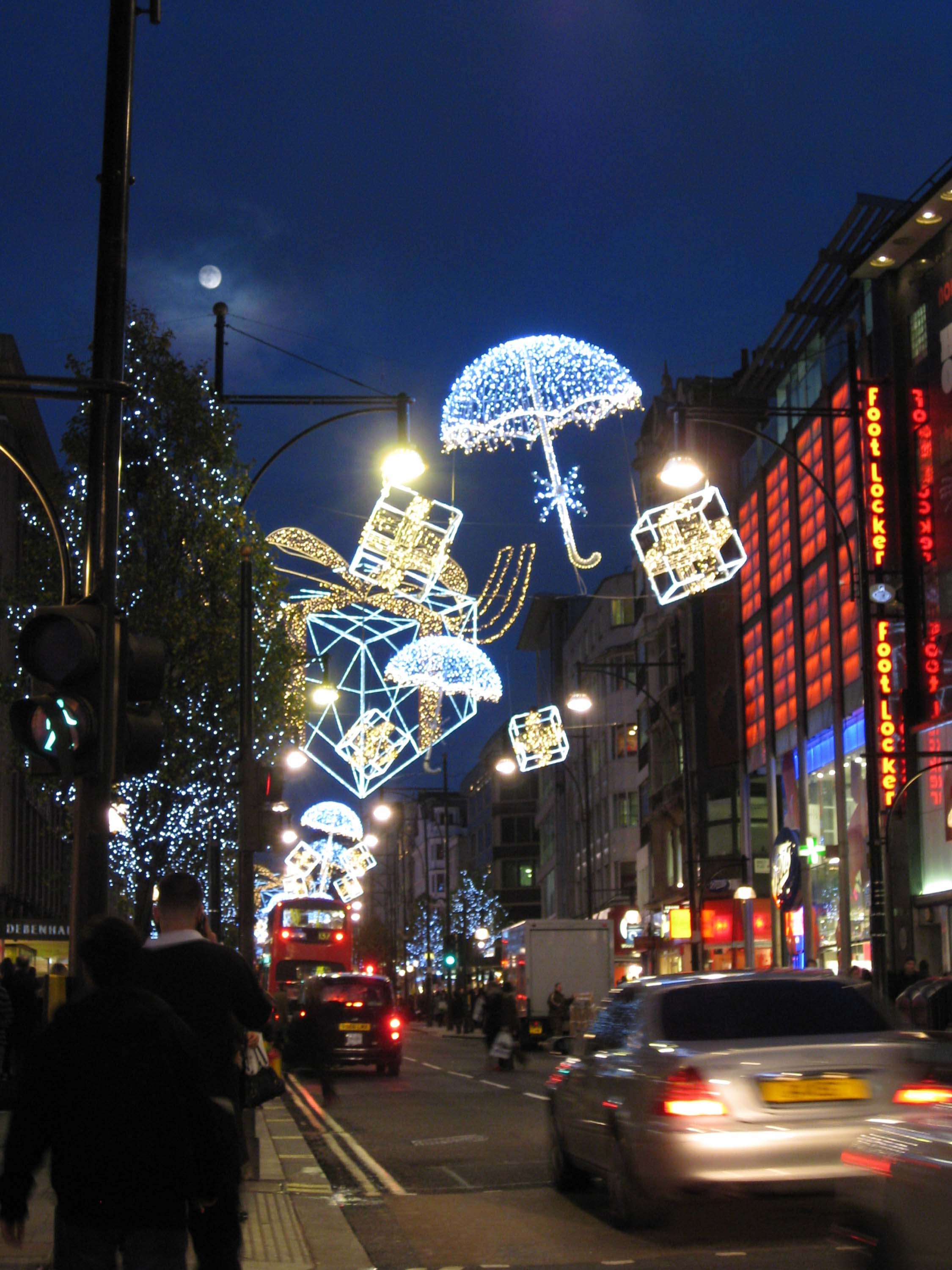 London had beautiful holiday lights in the main shopping district. Umbrellas – how appropriate for London!