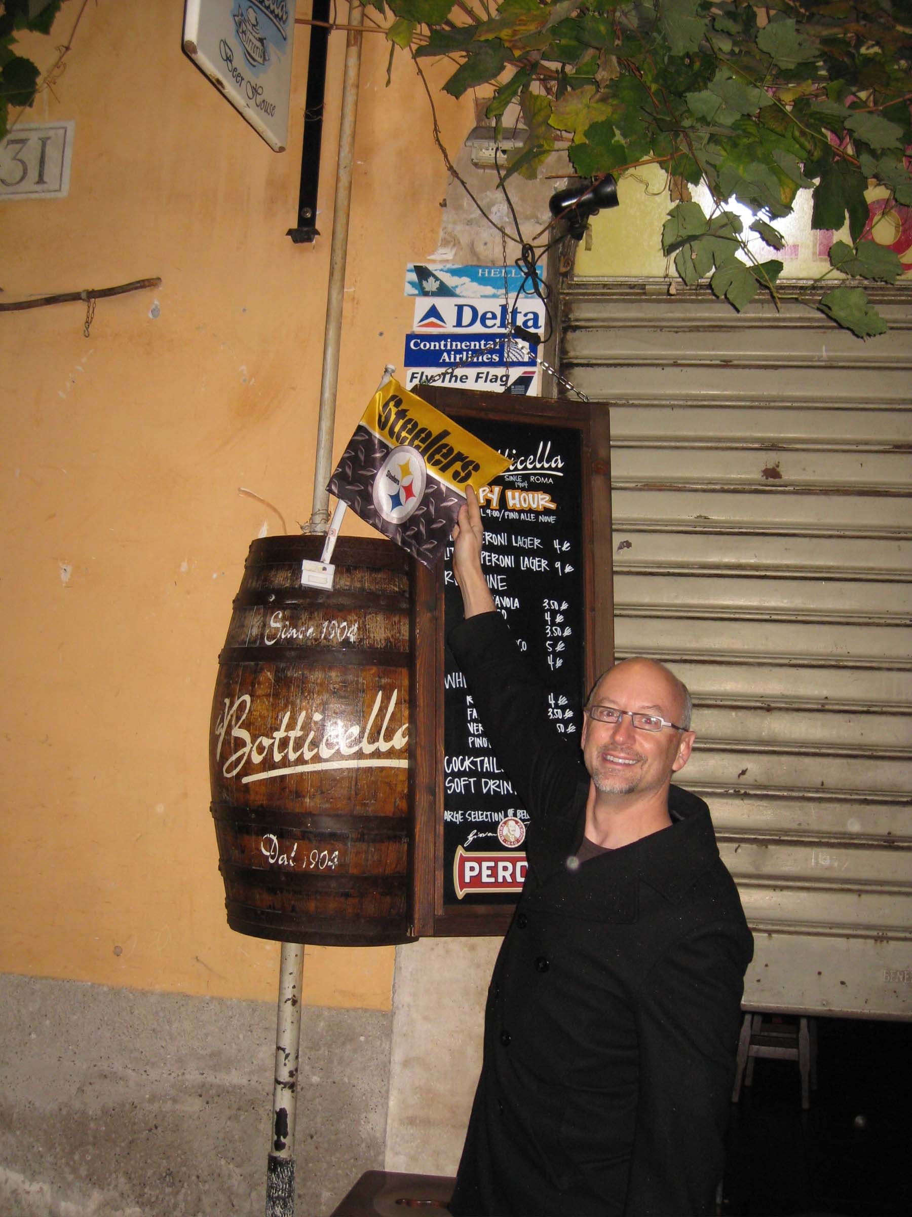 There are Steelers fans around the world. D is standing in front of the one and only Steelers bar in Rome. The owner plays all the games live, and if it is a late night game, that means it would be on at 3 am!