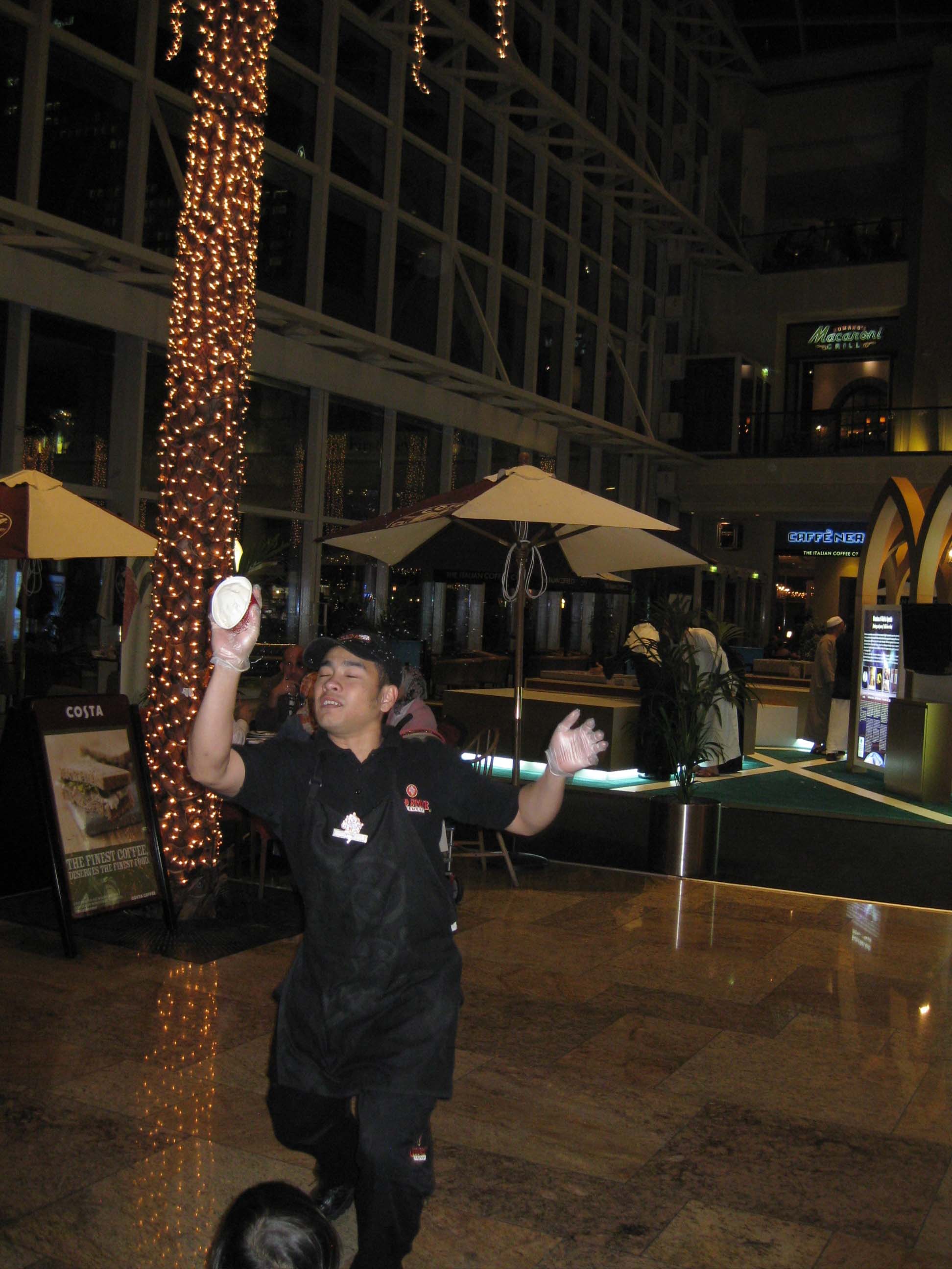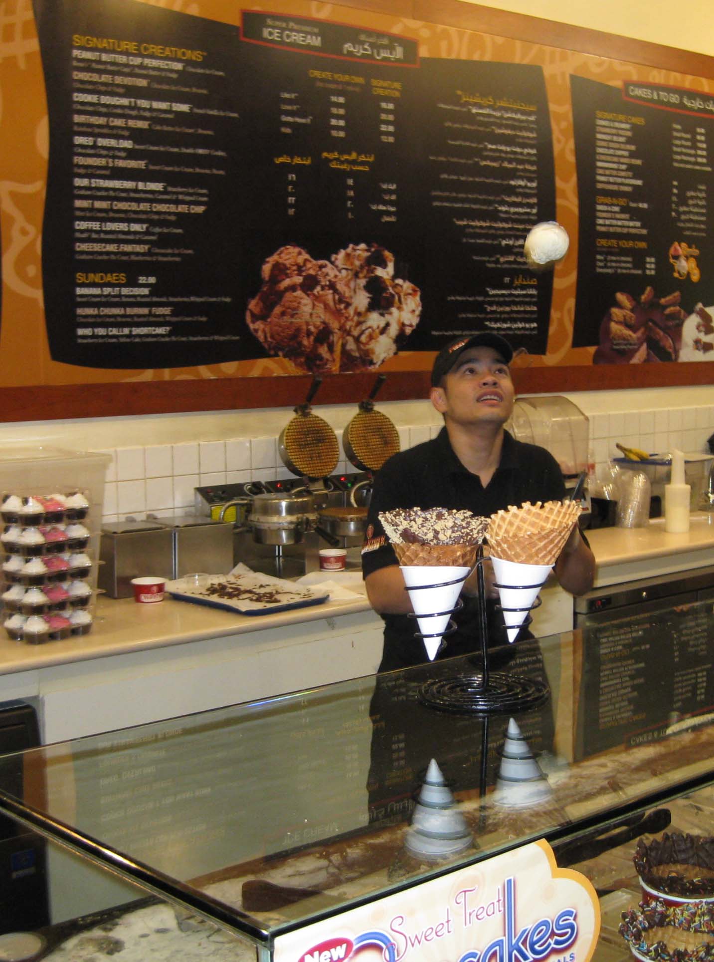 They are even tossing scoops acoss the entire store. One of the workers runs out into the mall to catch the scoop. Lets just say for Dave's scoop, it was their fourth try – yes, several scoops on the floor.