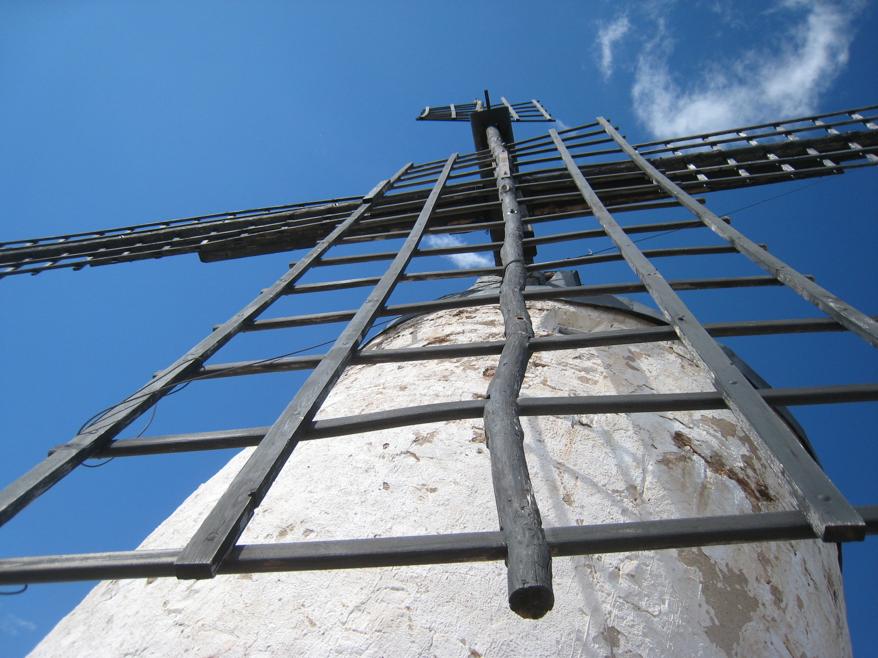 The story goes that Don Quixote saw the windmills and thought they were giants; the sails were the giant's arms. His sidekick Sancho tried to tell him they were windmills, but he tried to battle them anyway.