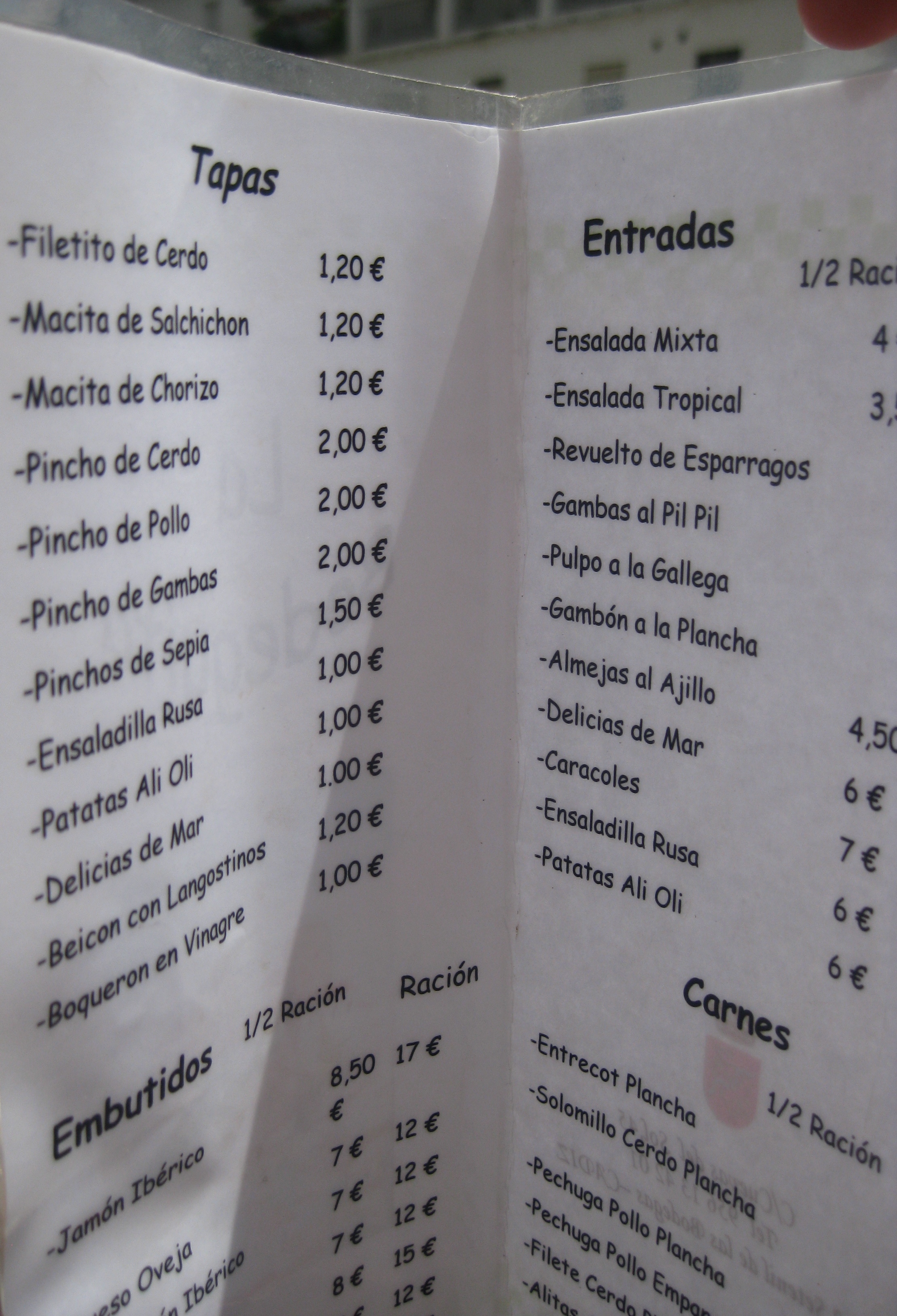 We arrived on a Monday, the day most restaurants are closed. We found one that was open but they were only serving one type of tapas (an appetizer or small snack in Spain). D ordered a beer, a lemonade ale for me, and the tapas dish. The bill… 2.10 euros. That is less than $3!!