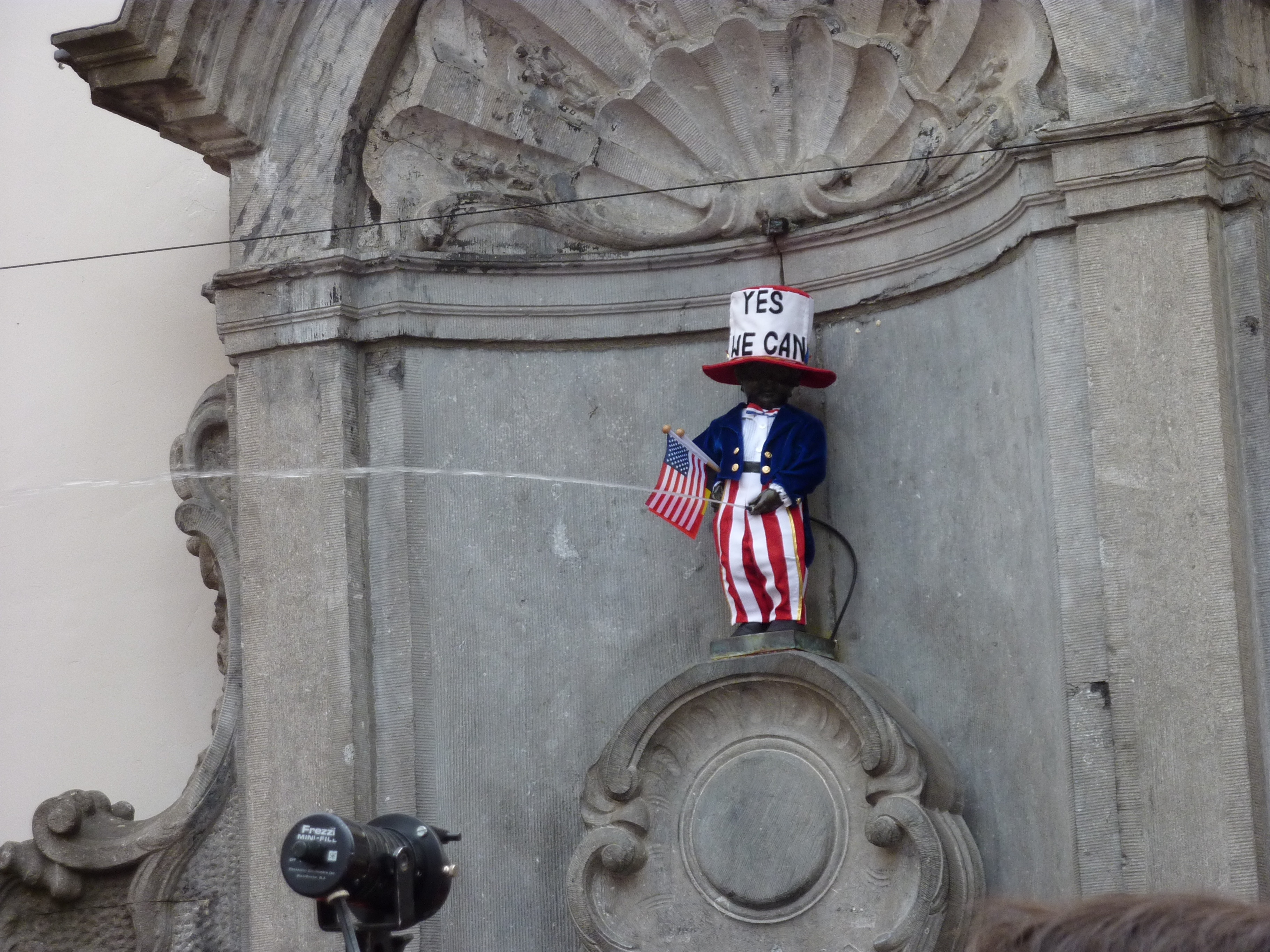 With the slogan "Yes We Can" on his hat and if you look closely he has both the US and the Belgian flag in his hand.