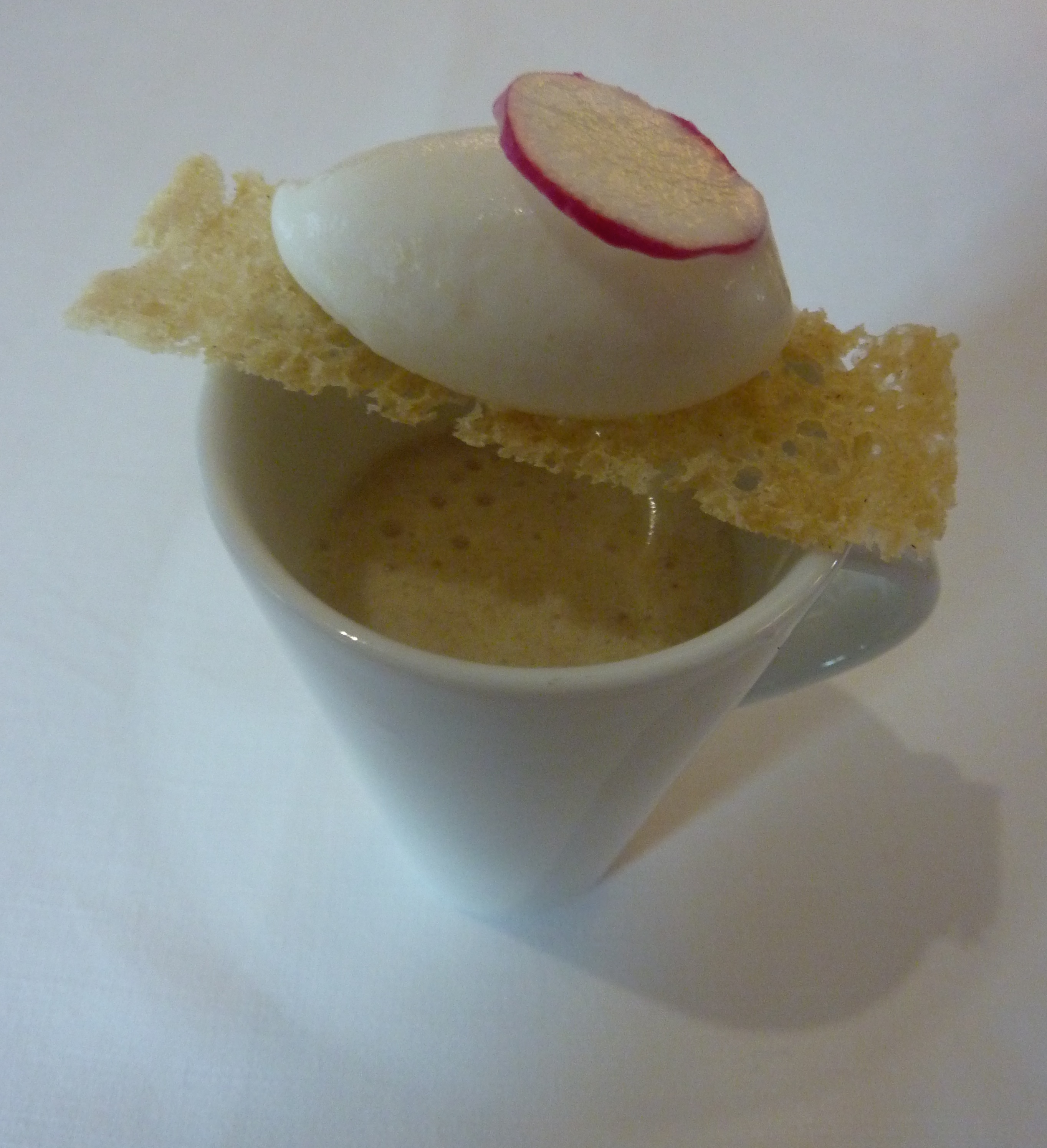 This was the pre-pre amuse-bouche. Tomato mousse with mini savory waffle. It is a little dark as I took this first photo without a flash. I was trying to be "cool". The restaurant was very relaxed so I didn't worry about the flash later. My Blog readers needed good photos!
