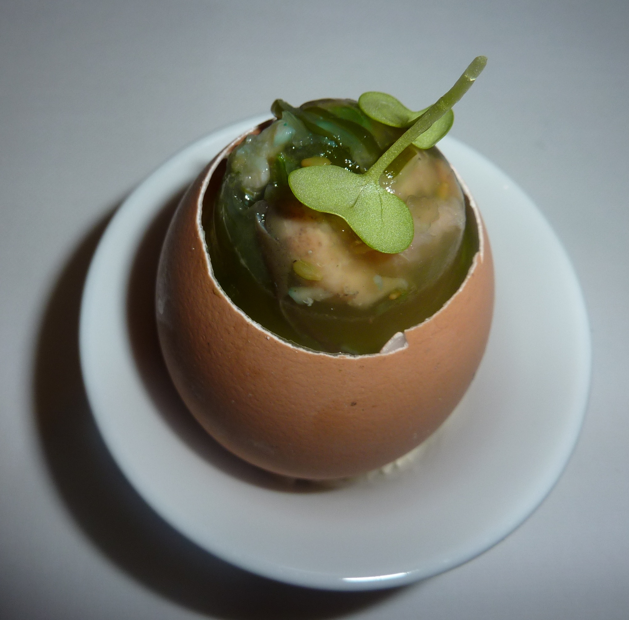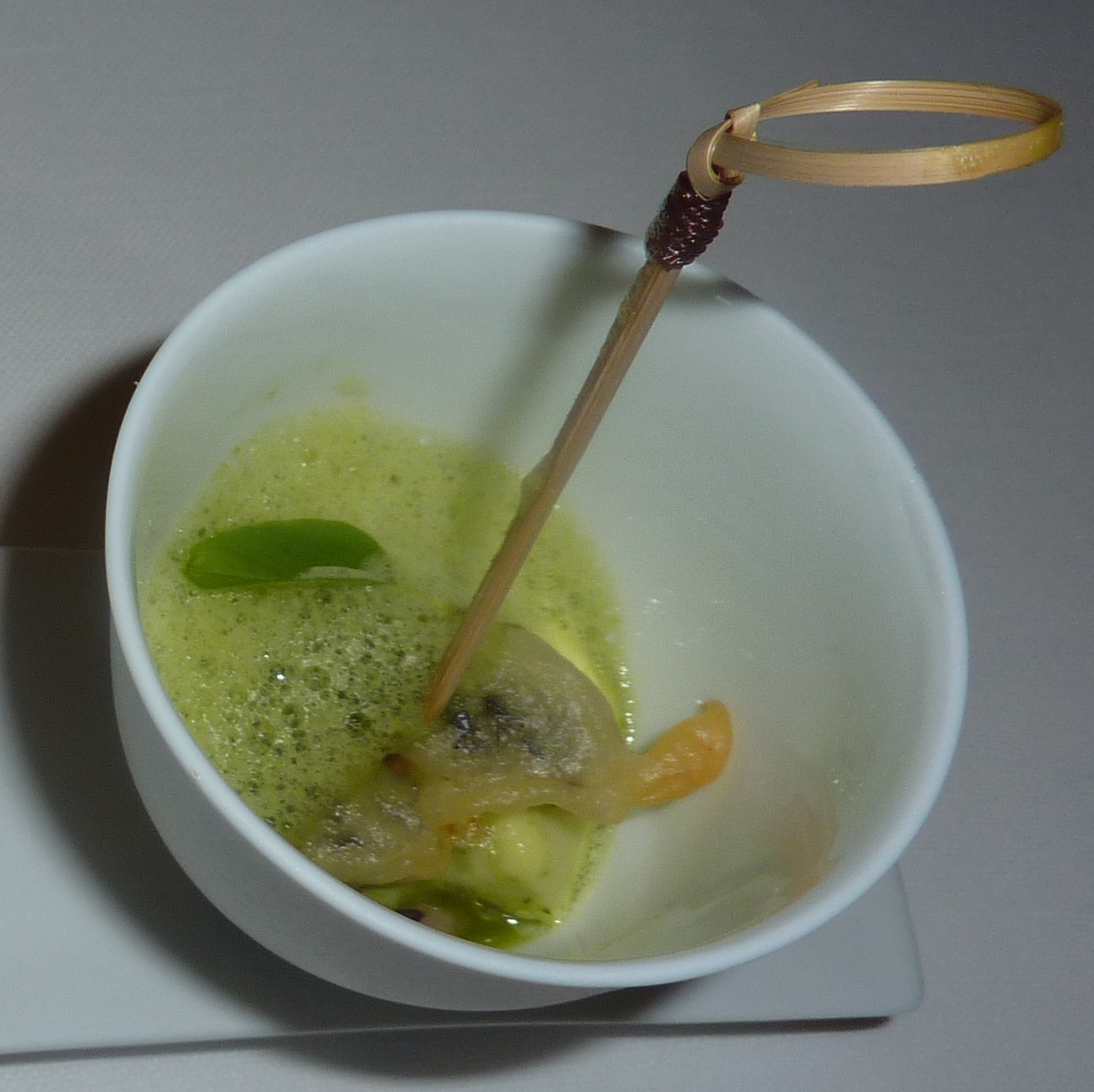 Wait, one more amuse-bouche – warm egg salad topped with shrimp and broccoli gelee. This one definitely tasted better than it photographed.