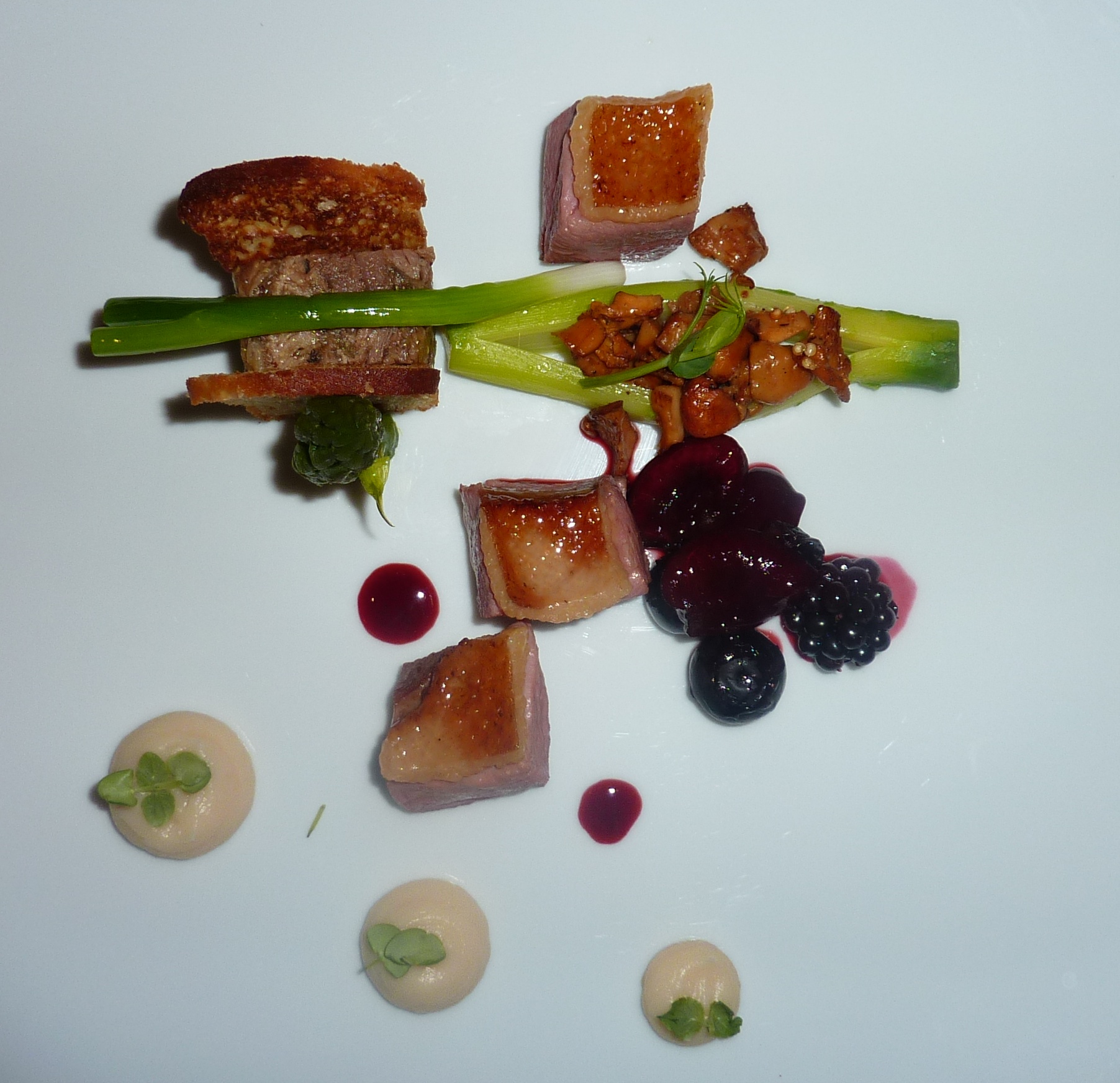 The second main course. It had a sauce, but I was so anxious to eat it, I forgot to take the photo after the sauce was poured. Duck breast, duck rillettes, asparagus, wild mushrooms, spring onion and red fruit.
