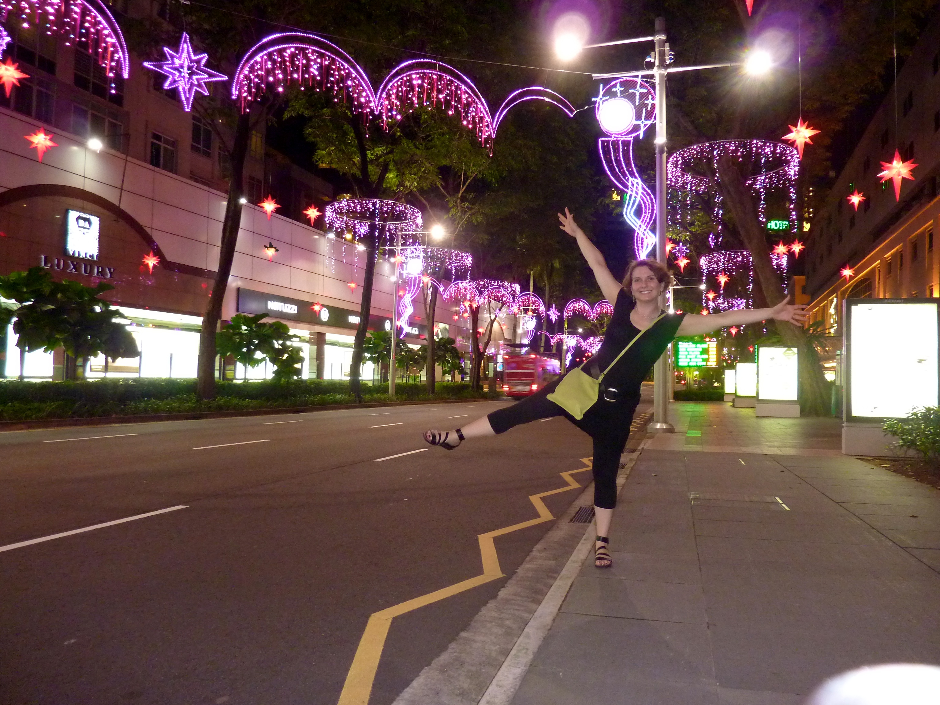And the colorful purple Christmas Street lights on Orchard Road, the main shopping street in Singapore. They were not going to be turned on until the weekend after we left, but for 15 minutes, they were testing them so I got to enjoy them. Beautiful but odd…….Christmas lights in 90 degree weather?
