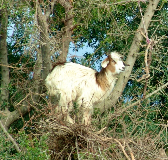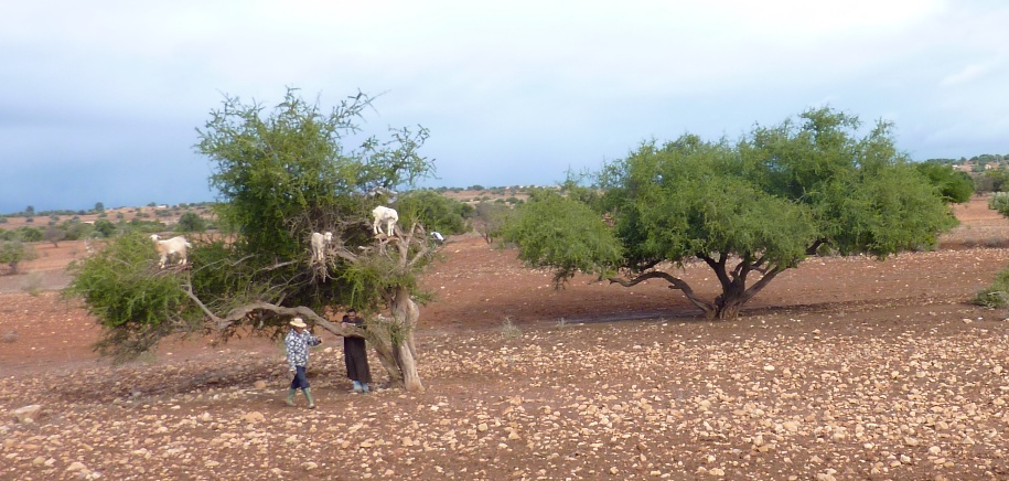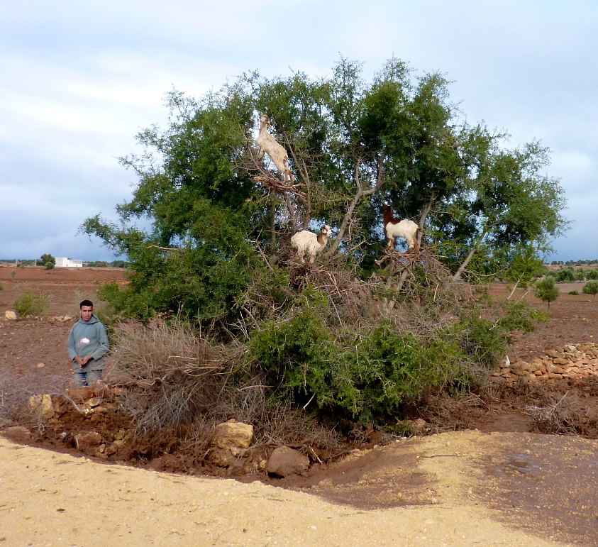 However, the goats really do climb the argon trees to eat the fruit, which is similar to an olive. Farmers actually follow the herds of goats as they move from tree to tree because the fruit of the tree has a nut inside, which the goats can't digest, so they spit it up or excrete it, which the farmers then collect. The nut contains 1-3 kernels, which can be ground to make argon oil used in cooking and cosmetics.