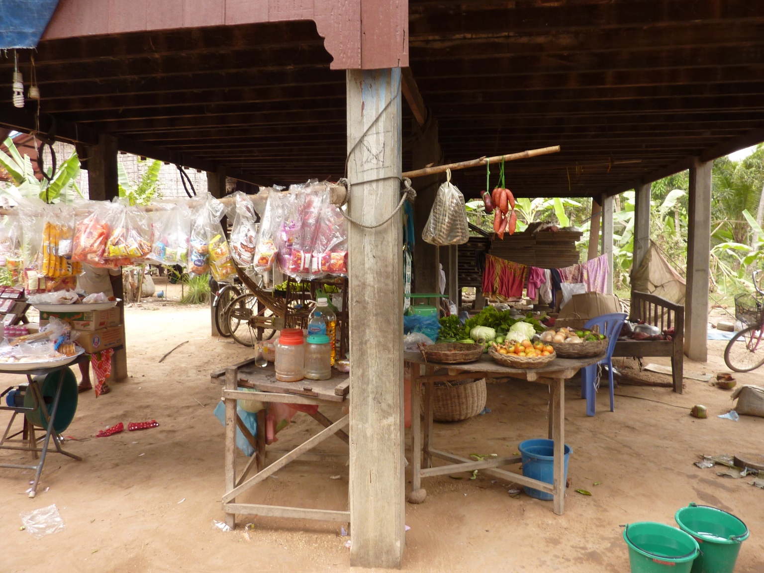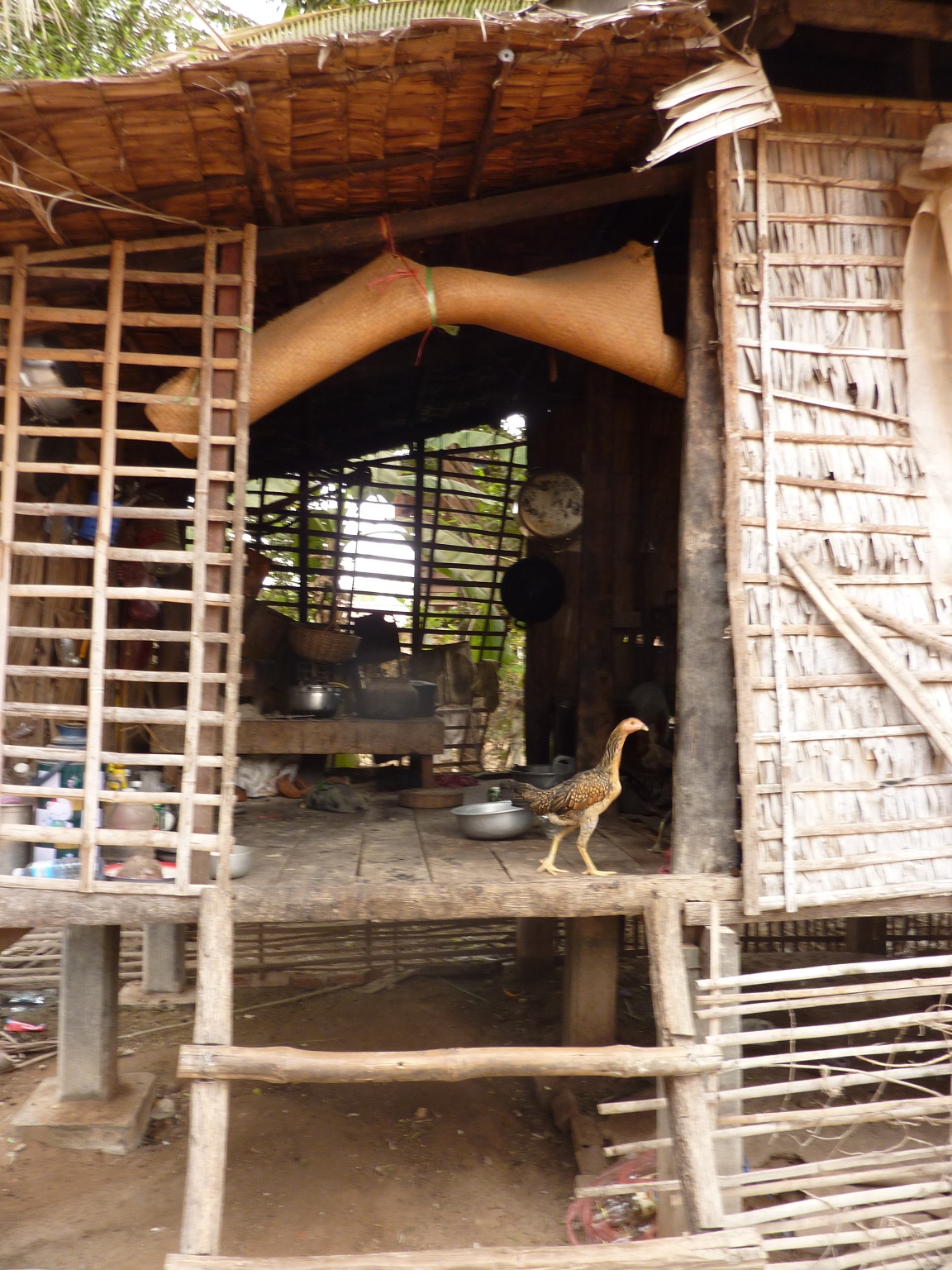 All of the houses are built on stilts for many reasons – because of floods, to keep out wild animals, and it provides shade during the hot day. With no walls, the air can flow freely. We even saw a few put the cows and oxen under there for shade.