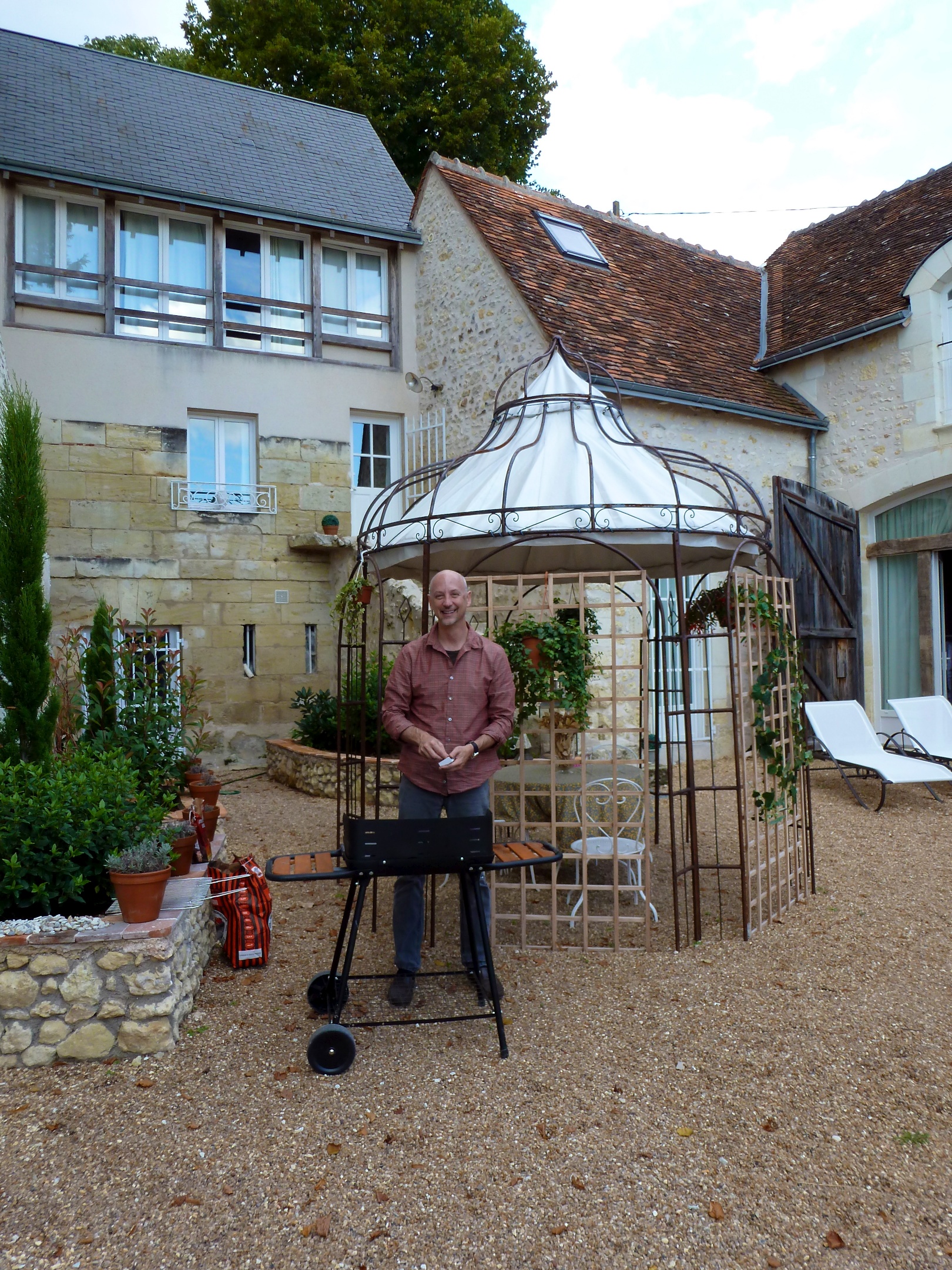 The house was an old vineyard/barn that they refurbished. Our room is the one on the far wall; the windows were where our loft bedroom was. One evening the owners, Anna and Richard, invited us to join them for a glass of wine. She spoke very good English; his English was about as good as D's French so they both got to practice. It was a fun evening.