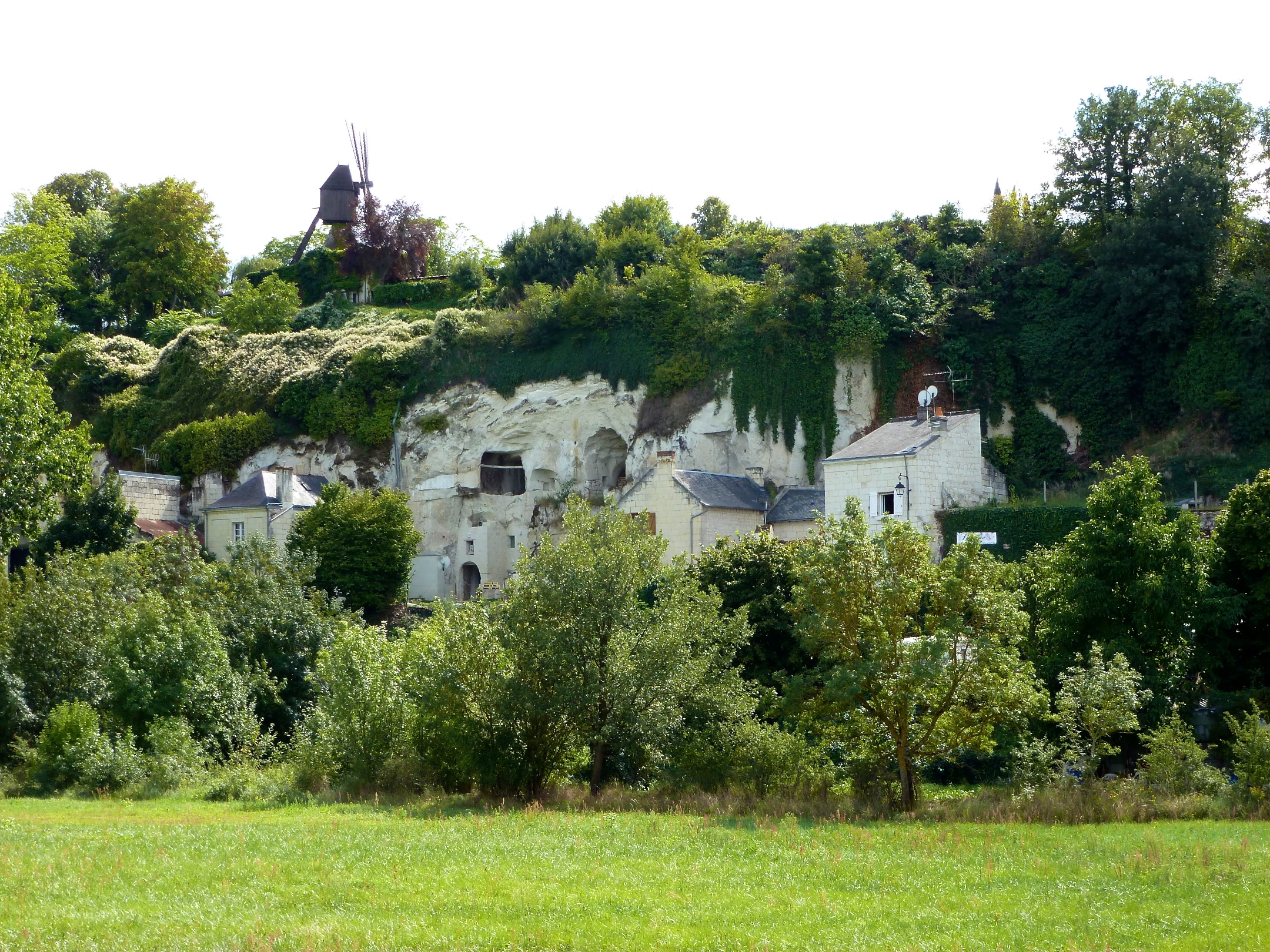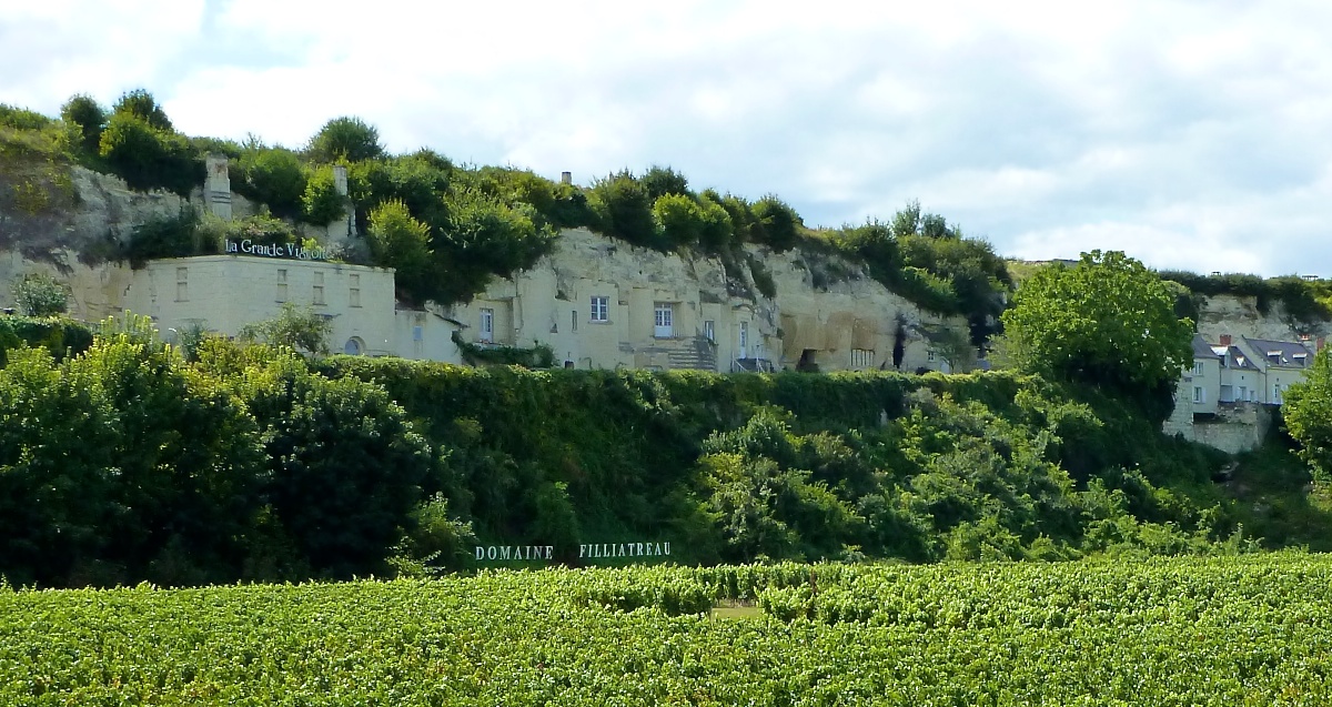 The stone is called Tuffeau stone and the caves were created when they mined the cliffs in the 15th century.