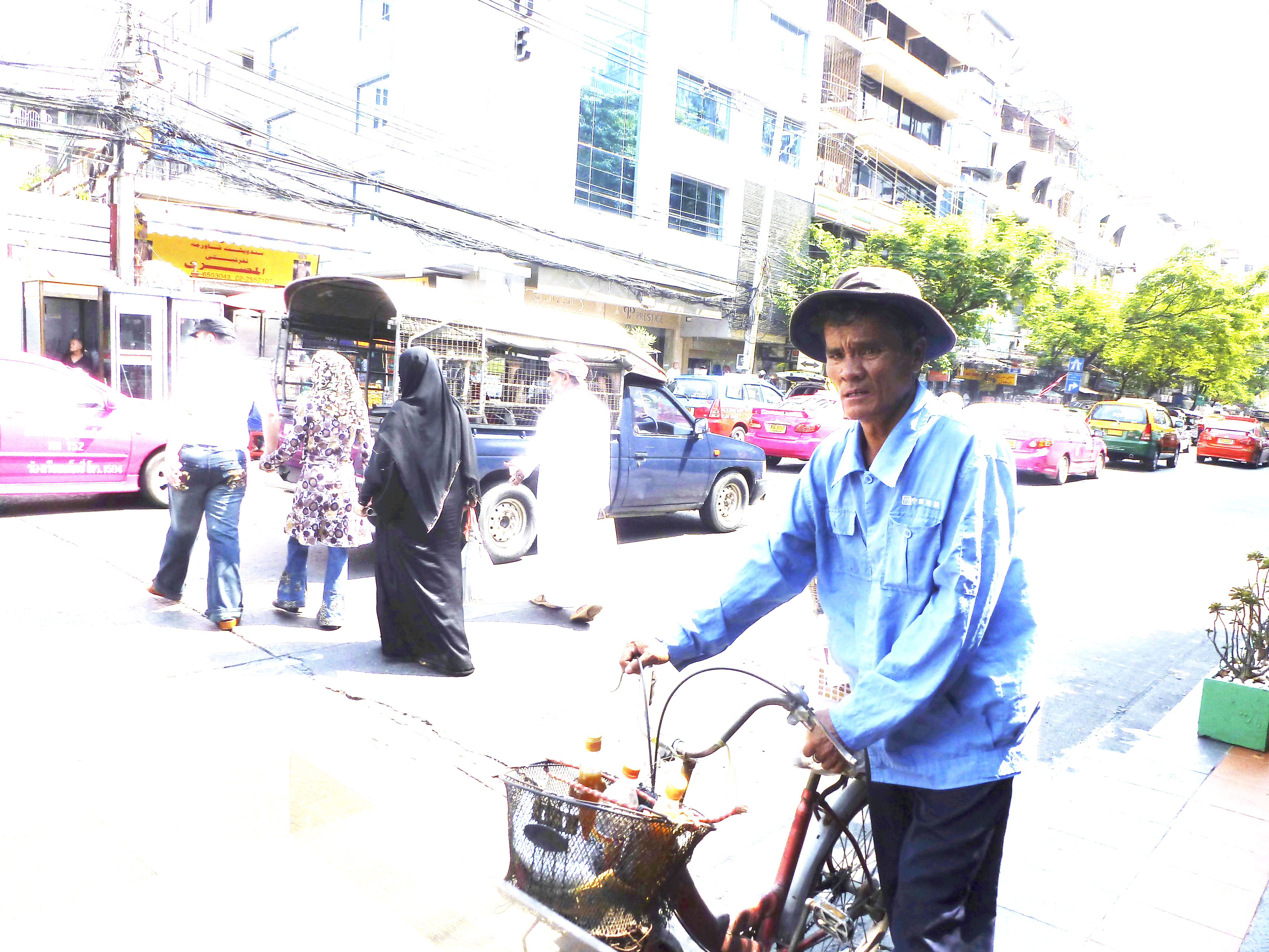 The streets are a world all unto themselves. The traffic is chaotic and there are people living and selling things on the sidewalks. The man on the bike is selling honey.