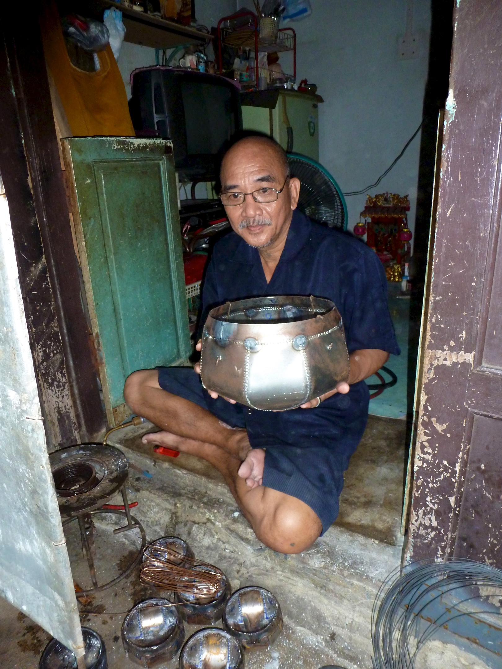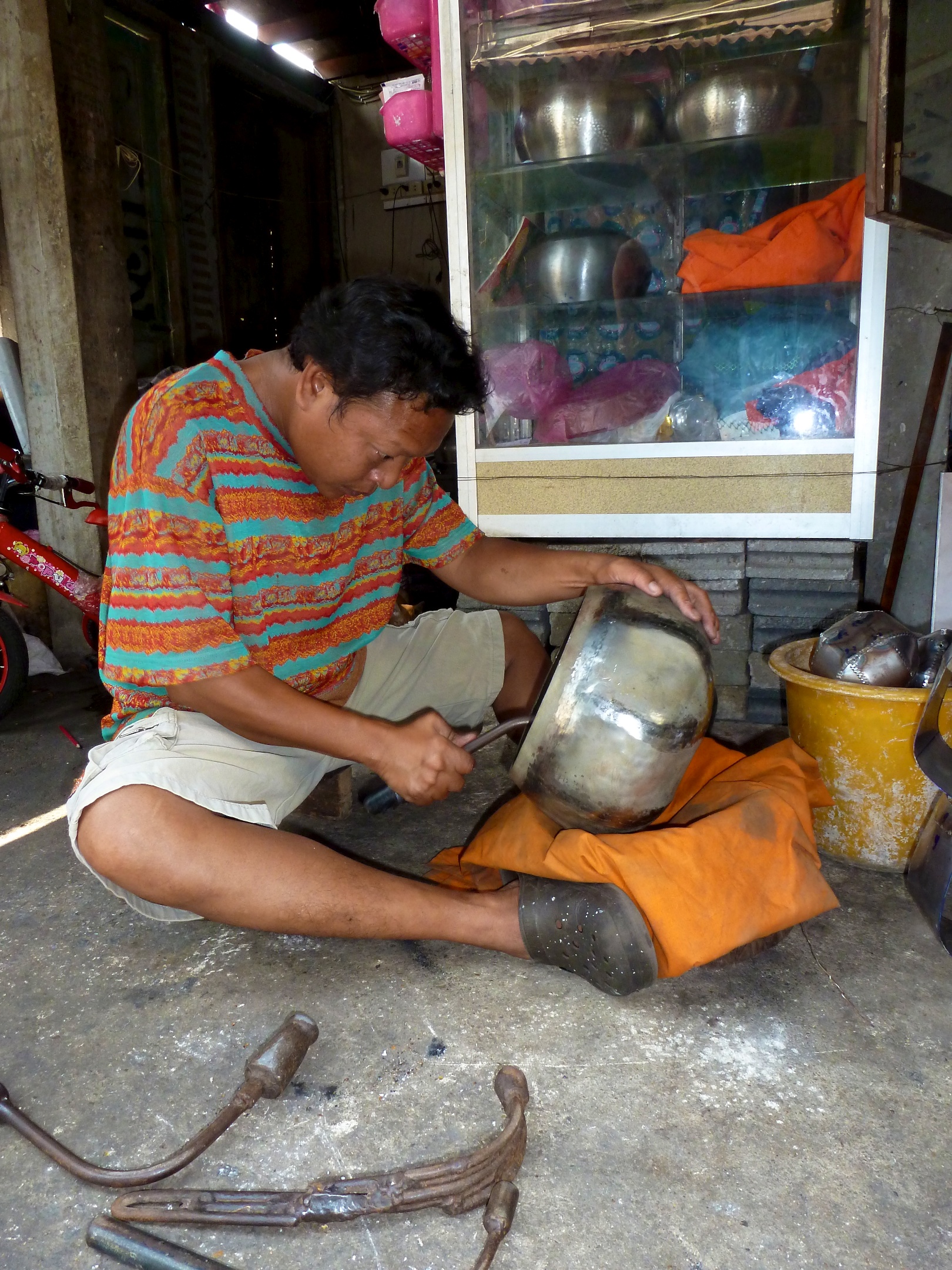 Next we visited a very unique little neighborhood where they still create the large alms that the Buddhist monks carry for their donations (food to live with). In the past, the alms bowls were all handmade. Today, most are mass-produced in the factories. It is a dying art.