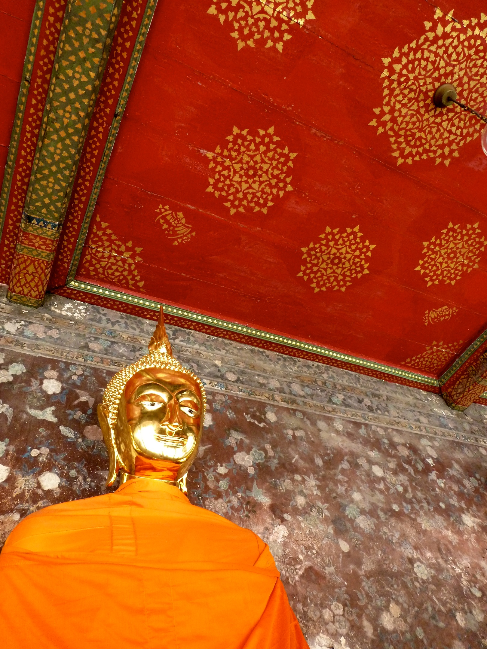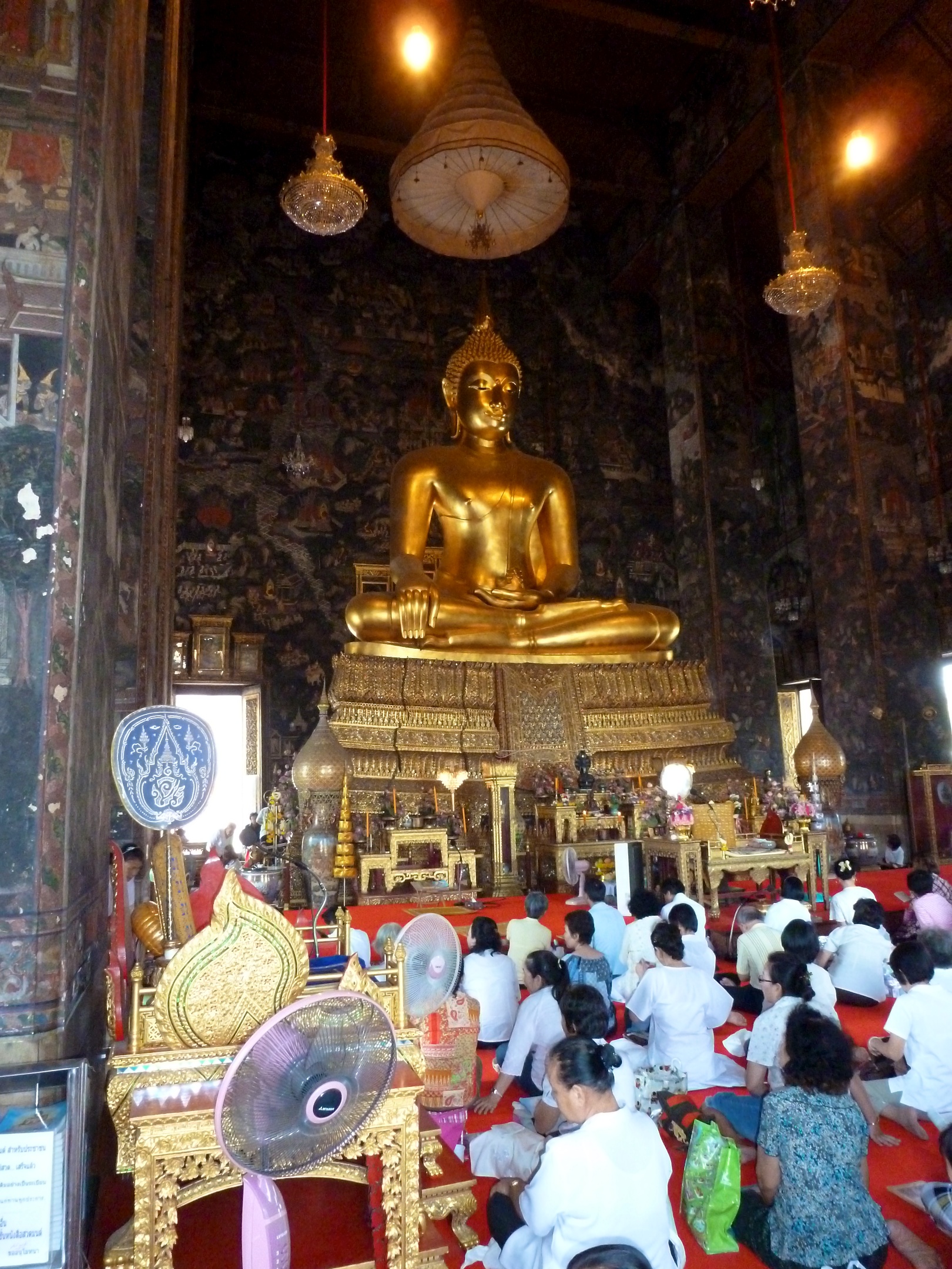 The large Buddha in the main hall dates to the 14th century. It was brought to Bangkok by Rama I, by boat, down the Chao Phraya River.