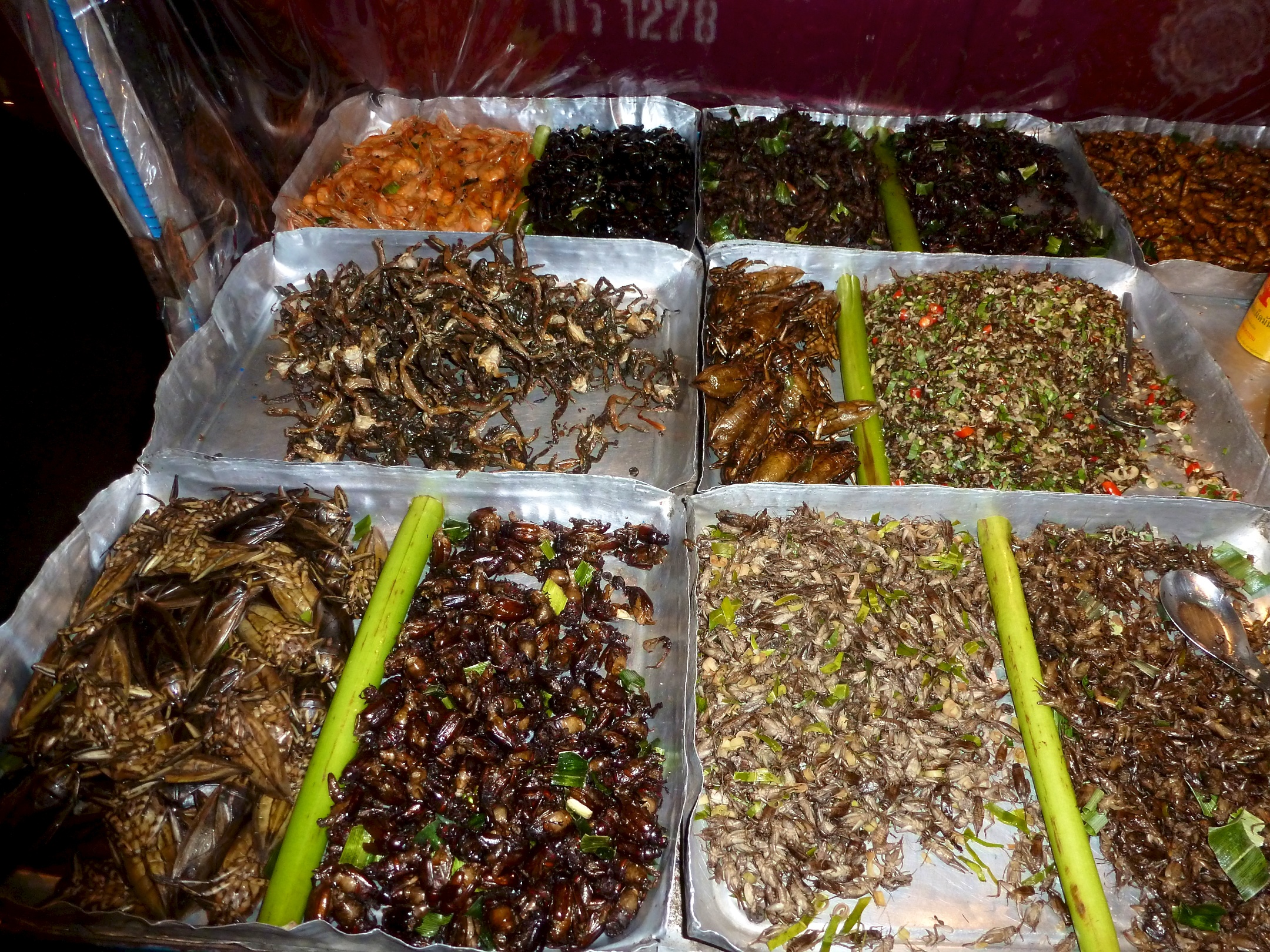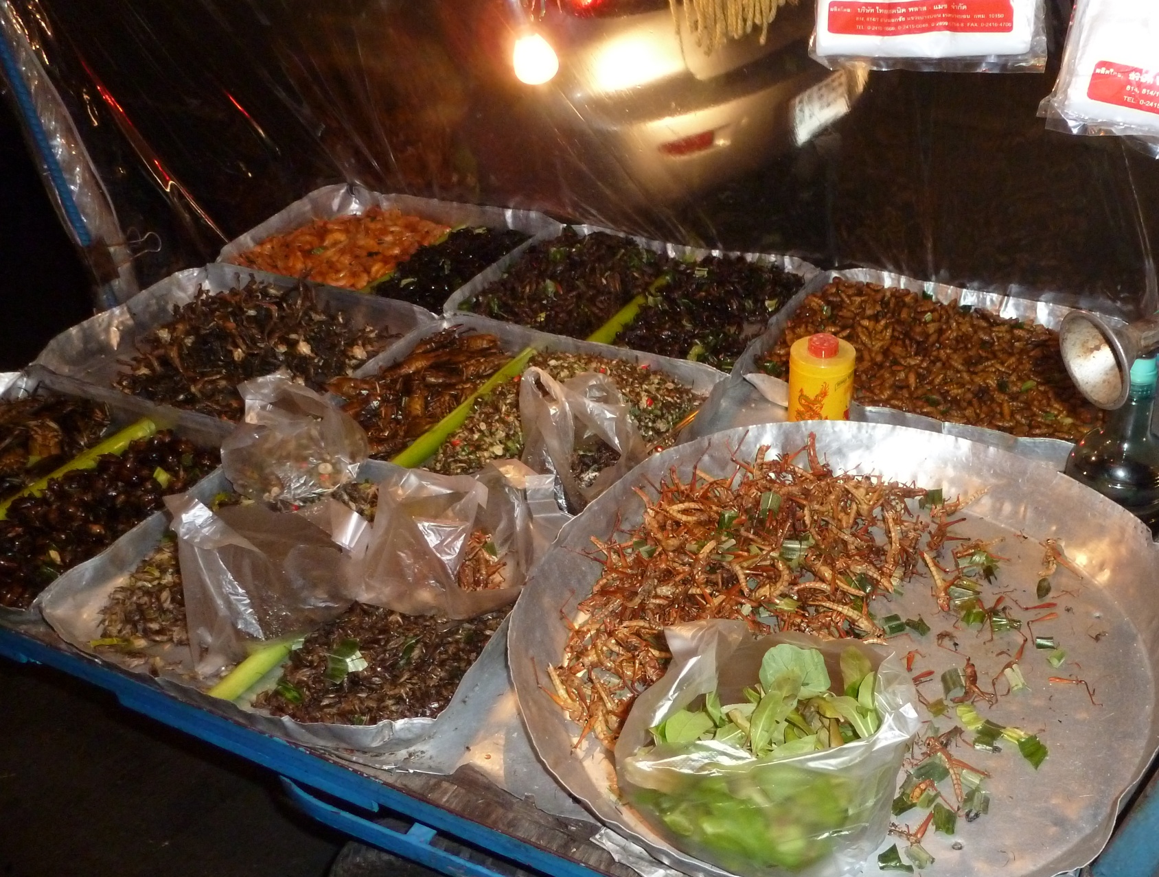 Yes – BUGS! Such a variety and lots of people were buying them. We talked to a few young girls buying them – they prefer the little larva ones. Maybe one day we will taste them : )