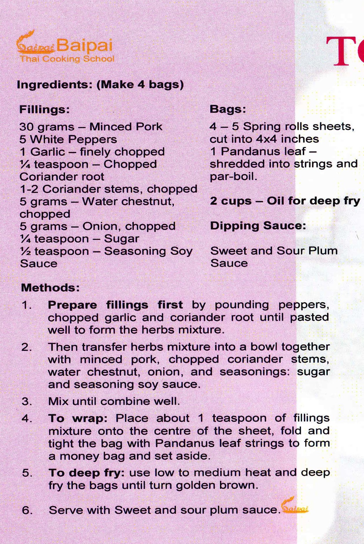 Here is the recipe for the golden bags (toong tong). They were very easy and quite good.