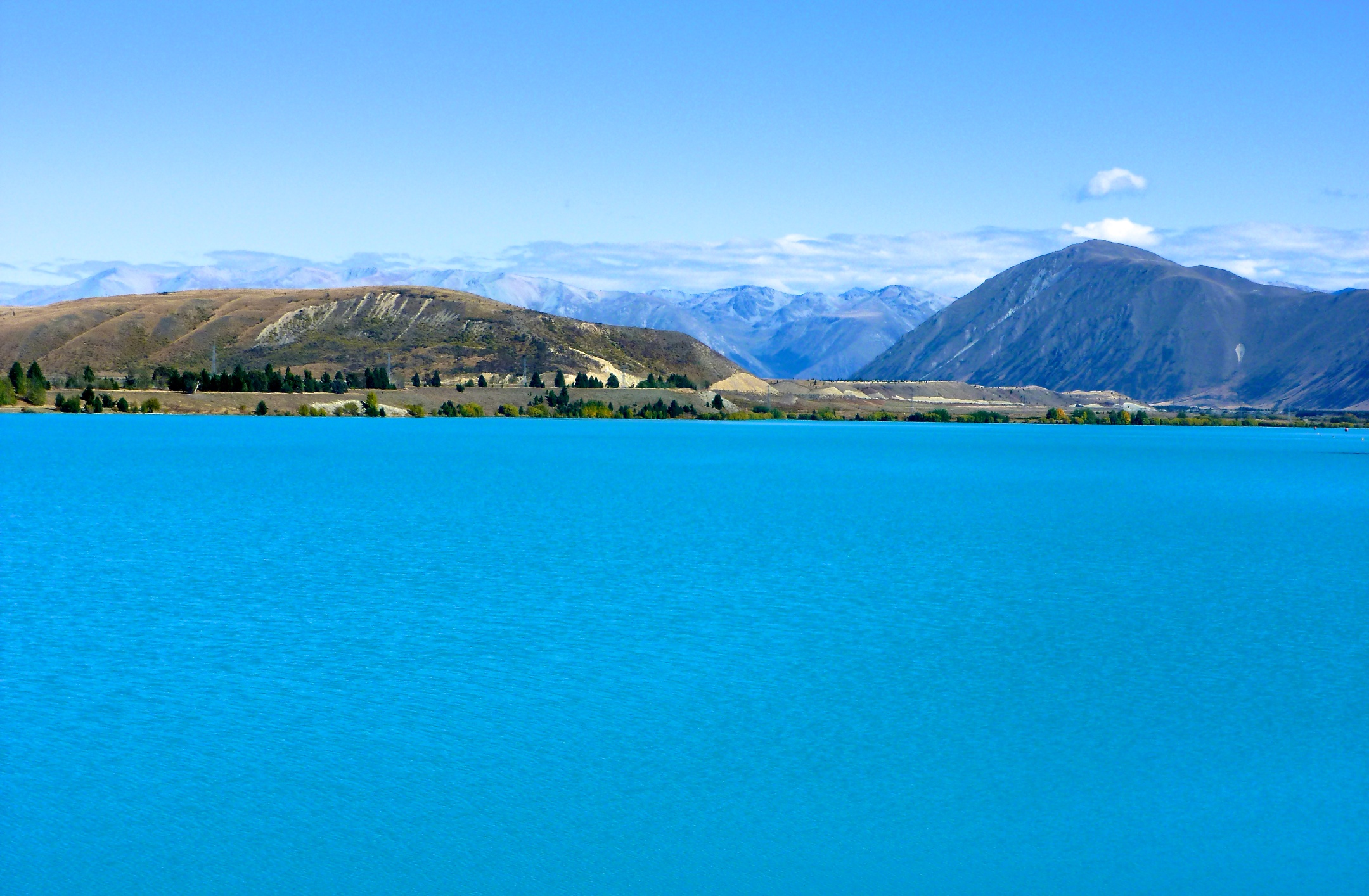 The amazing turquoise blue color of Lake Tekapo is created by "rock flour": the glaciers in the headwaters grind the rock into fine dust. These suspended particles in combination with the sunlight create Lake Tekapo's unique water color.