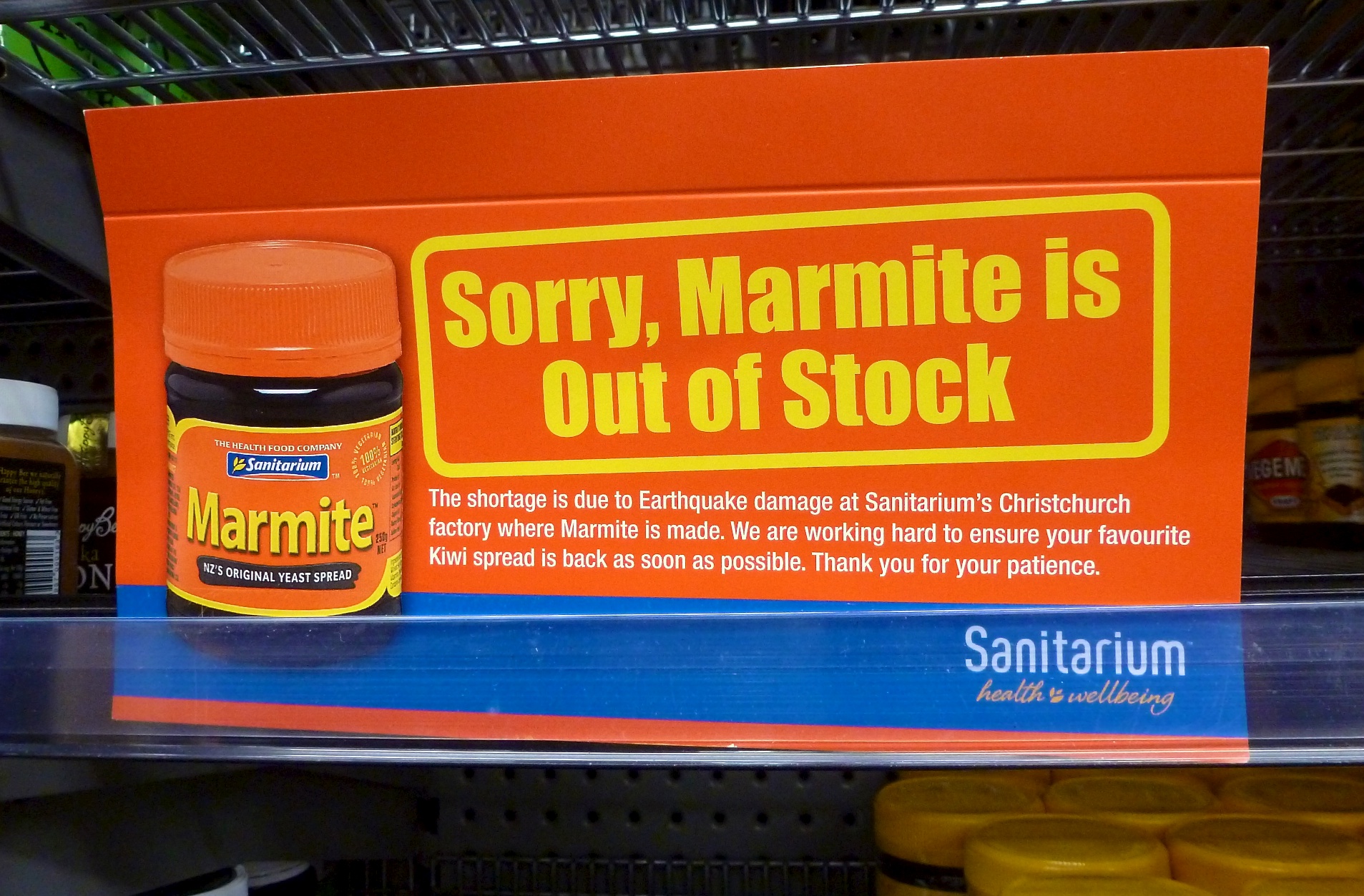 Marmite (a toast spread) is a "national treasure" and there was a big shortage going on while we were there. The plant that makes marmite is located in ChristChurch and was damaged by the earthquake.