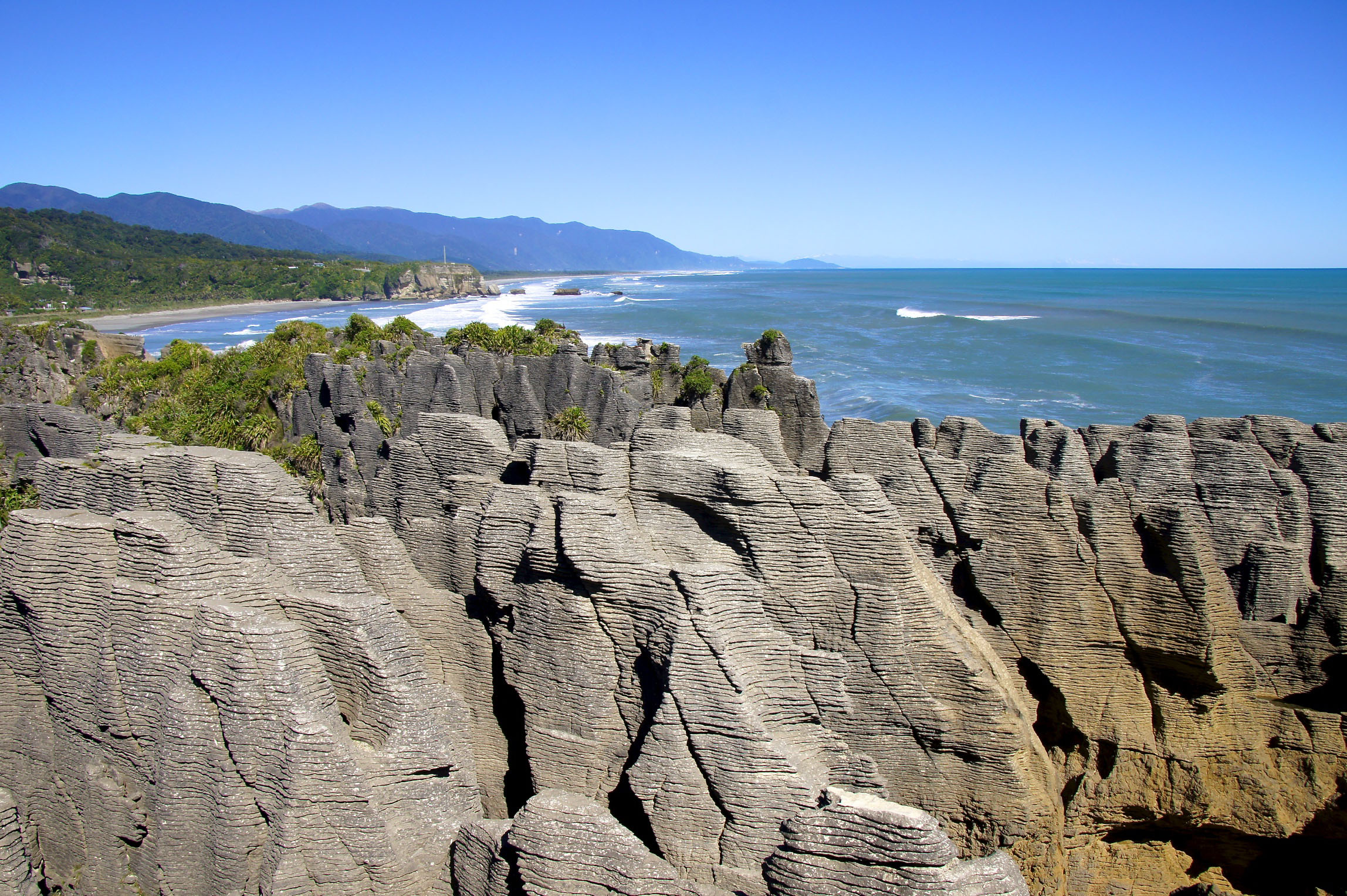 Punakaiki had very interesting rock formations called the Pancake Rocks. It is a heavily eroded limestone area where the sea bursts though a number of vertical blowholes during high tides.