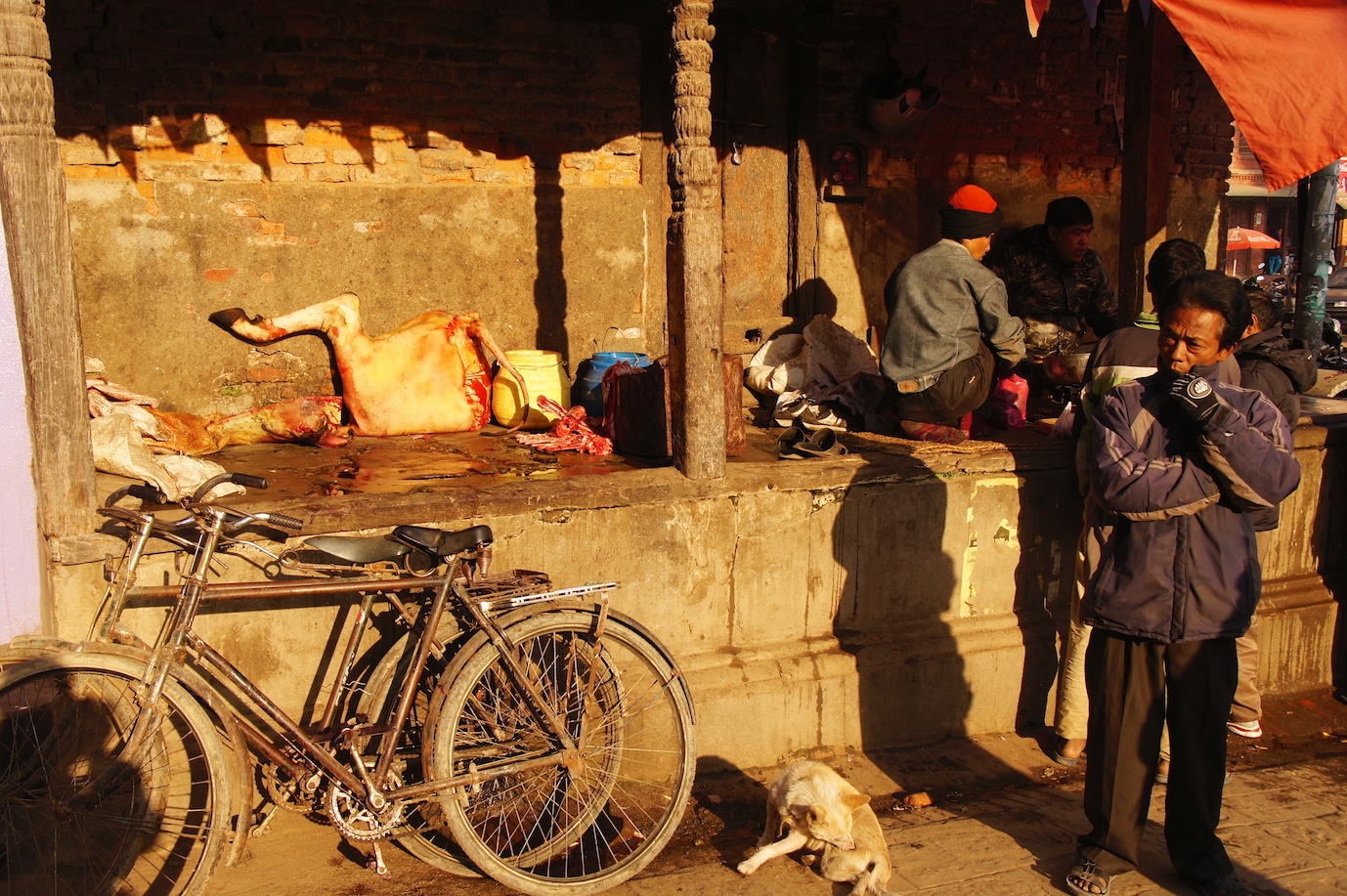 Nepalese do eat buffalo as being sold by the local butcher below. Really, this is a "butcher shop."