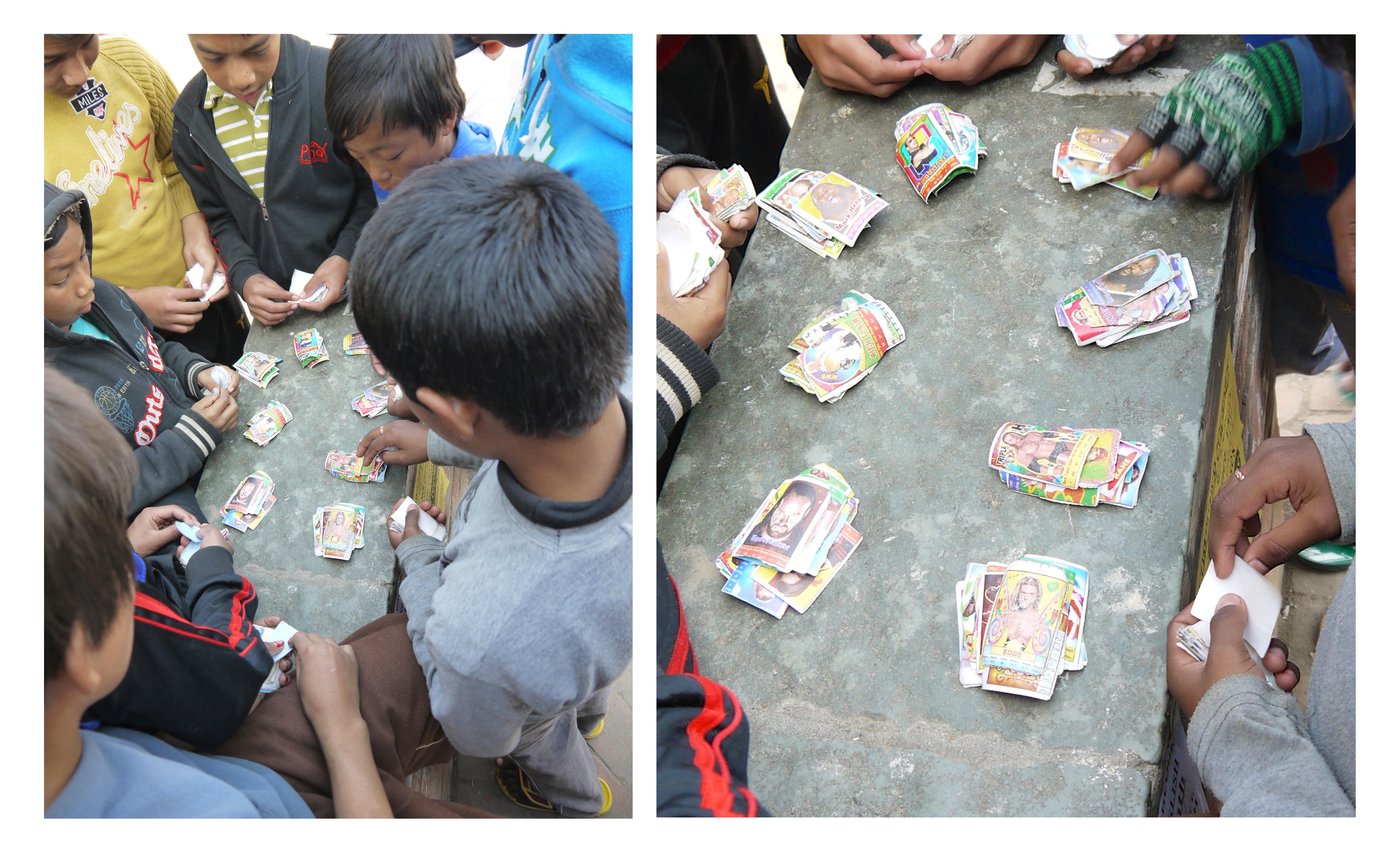 The kids were playing a game swapping cards. Not sure if you can tell, but the cards are American wrestlers. Pro Wrestling cards were collected by all the boys we met.