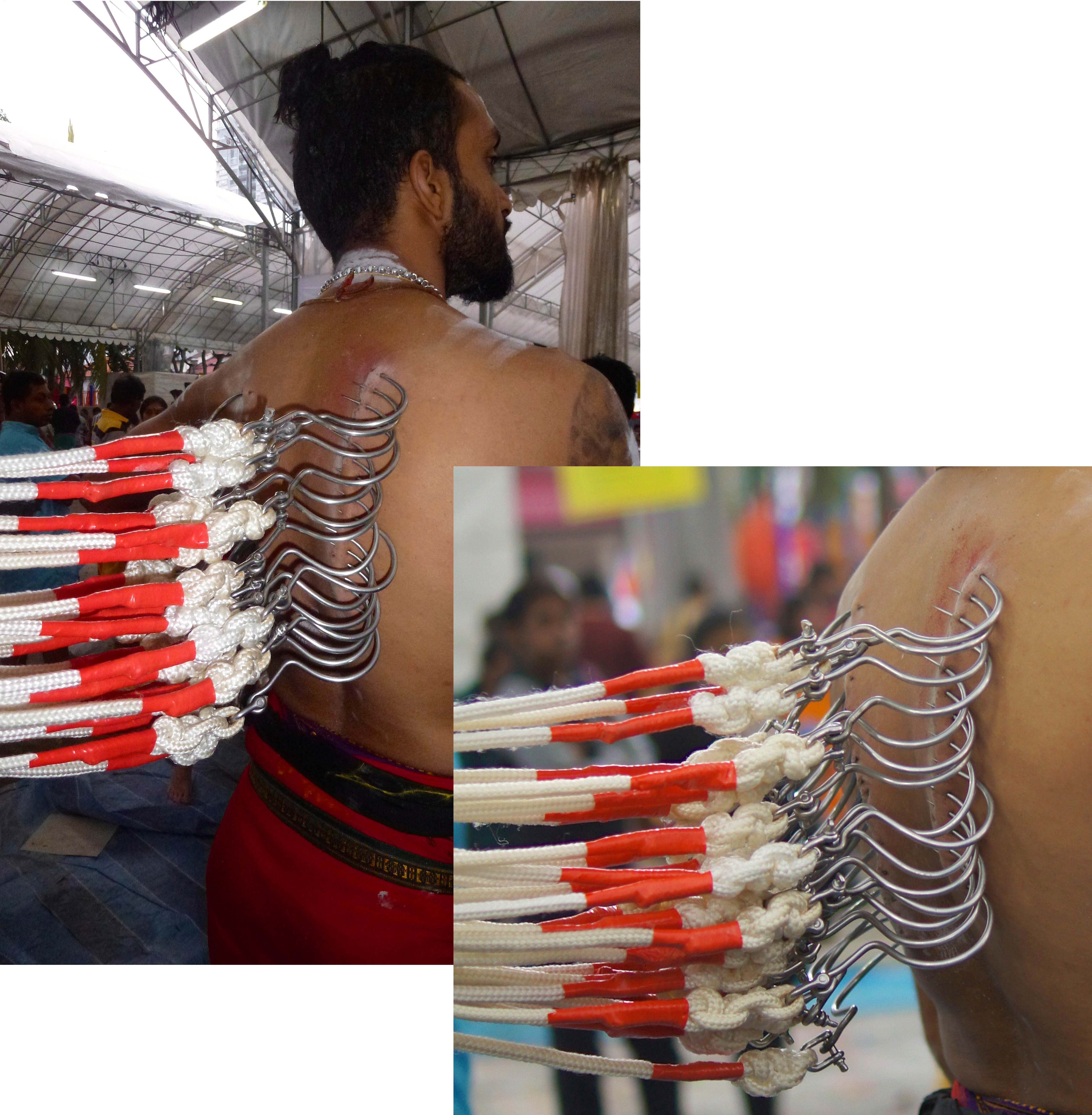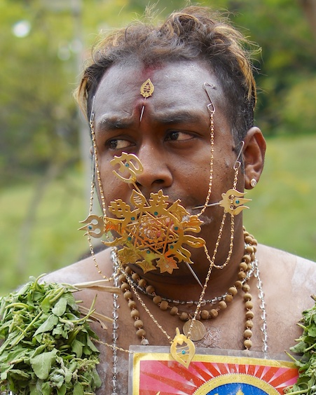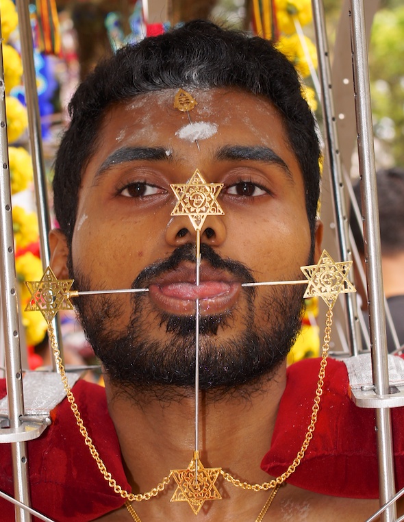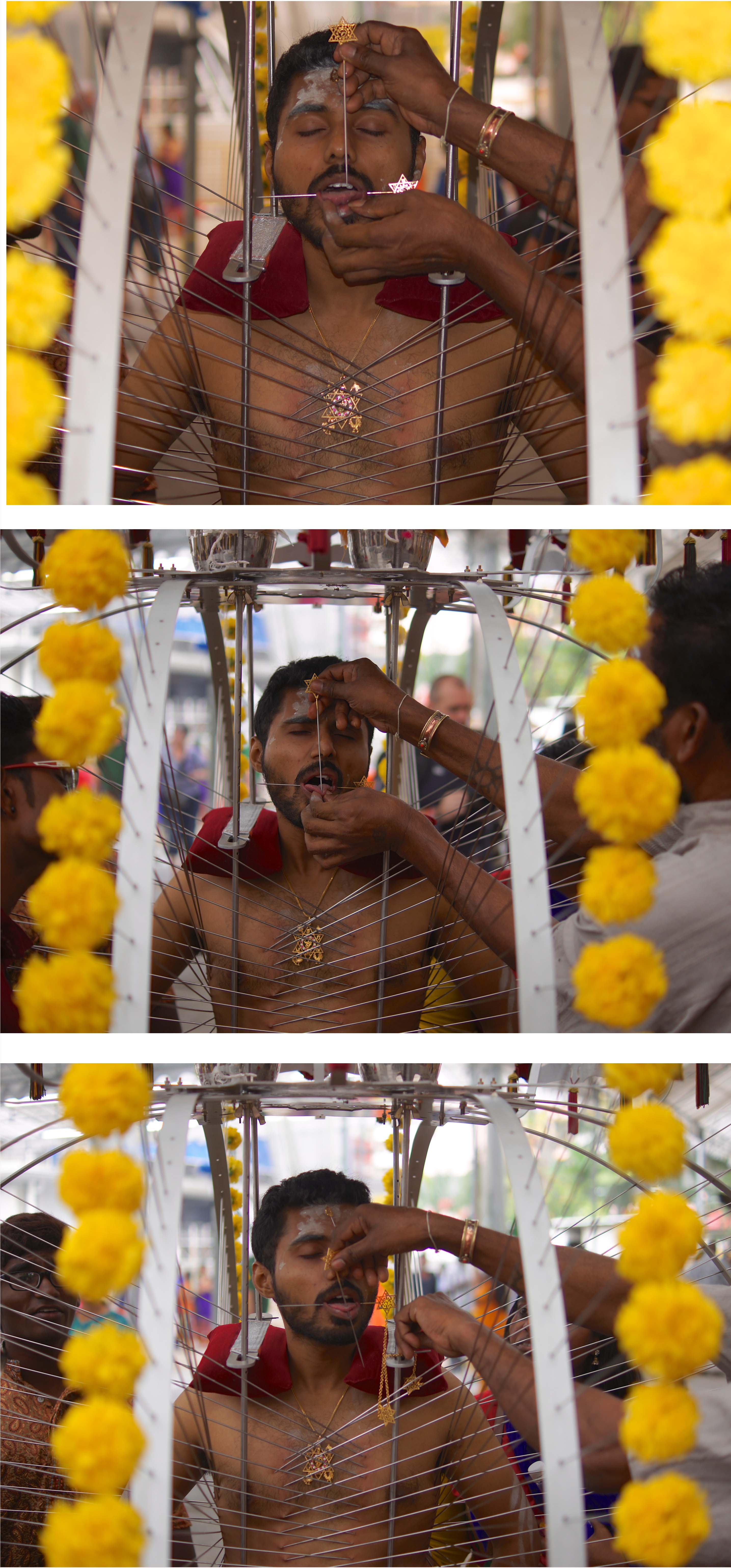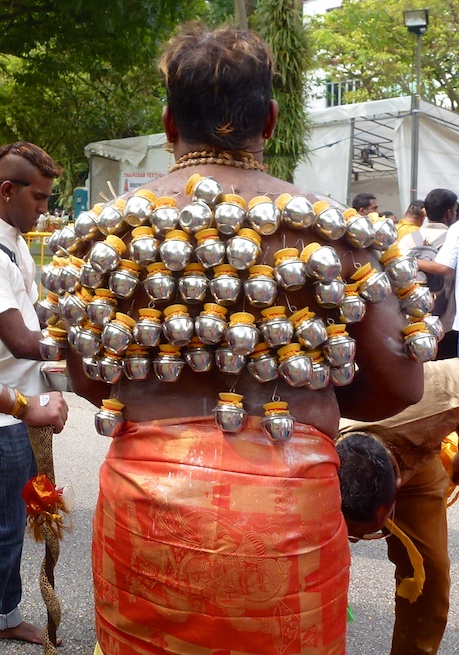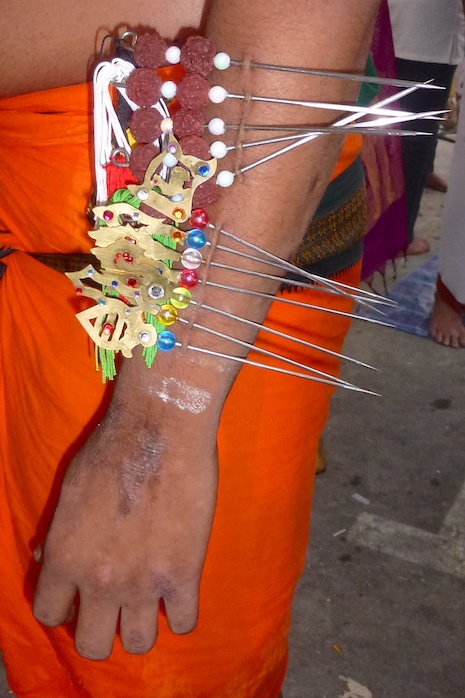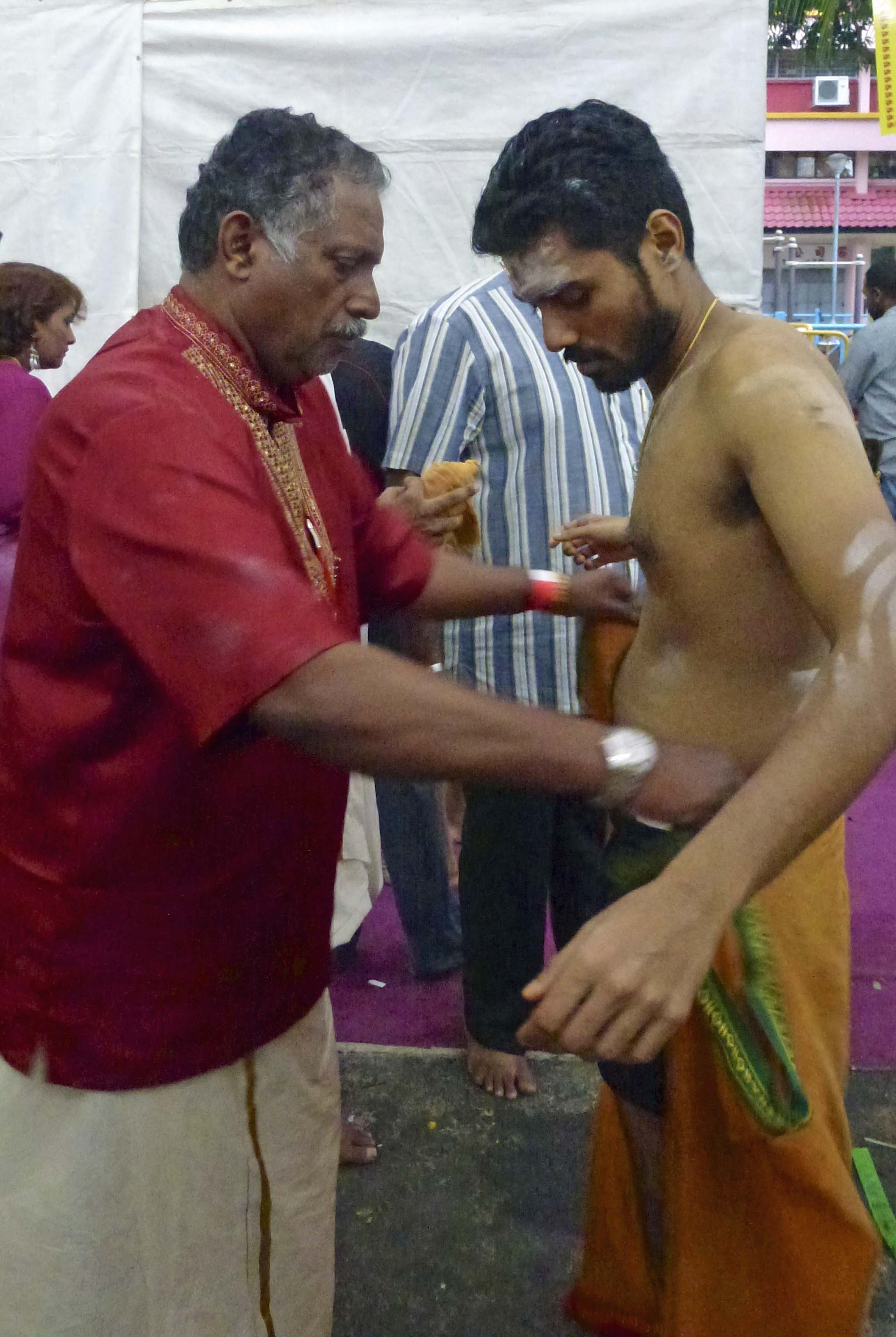 Next all of the spears are put in place. Family and friends do the piercings. And they do go through his skin. Most devotees pierce themselves, as they believe it will please Lord Murugan and he will fulfill their wishes.