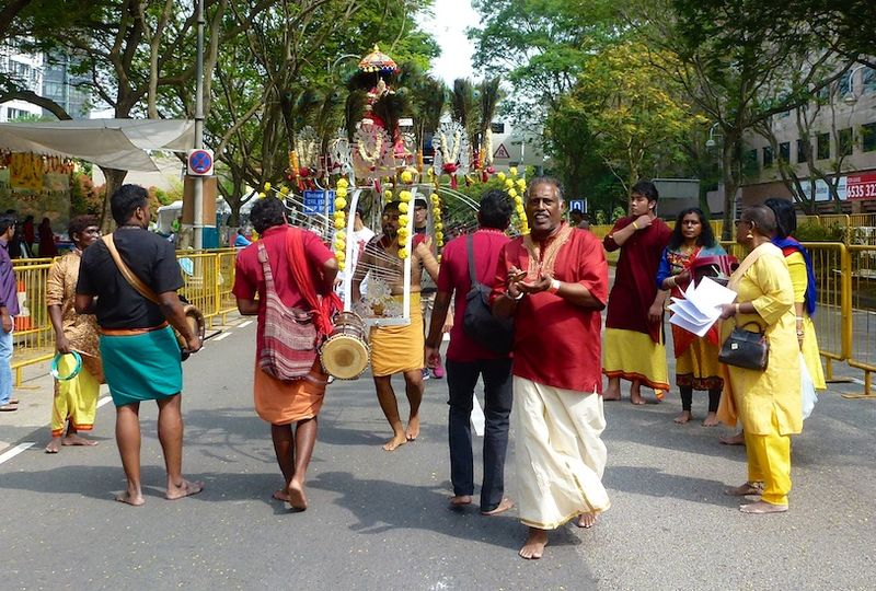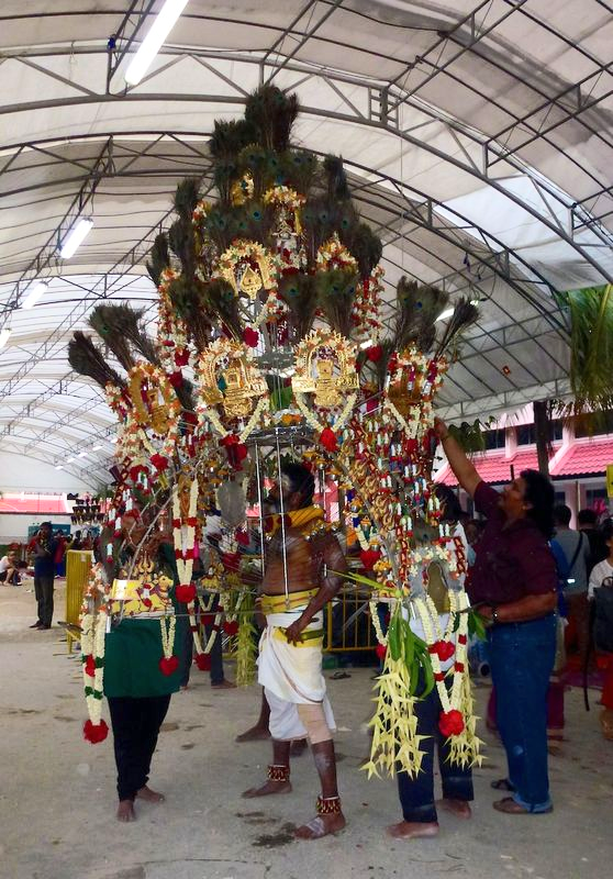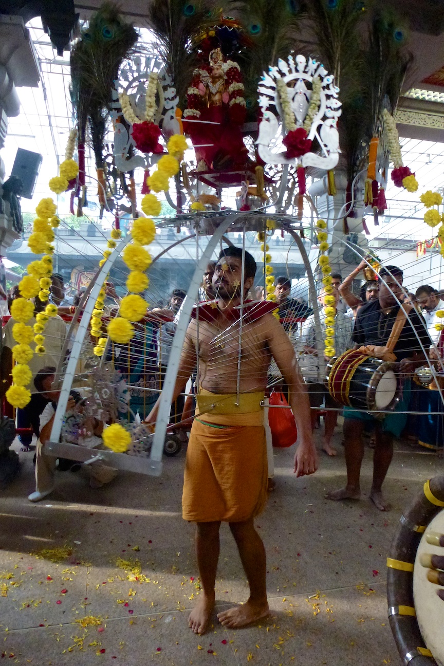 The procession starts at the Sri Srinivasa Perumal Temple and ends at the Sri Thendayuthapani Temple. It is a 3-mile walk and everyone, including us, must go in bare feet. There is one other option, to walk it on spiked shoes. It took us about 5 hours for the entire walk.