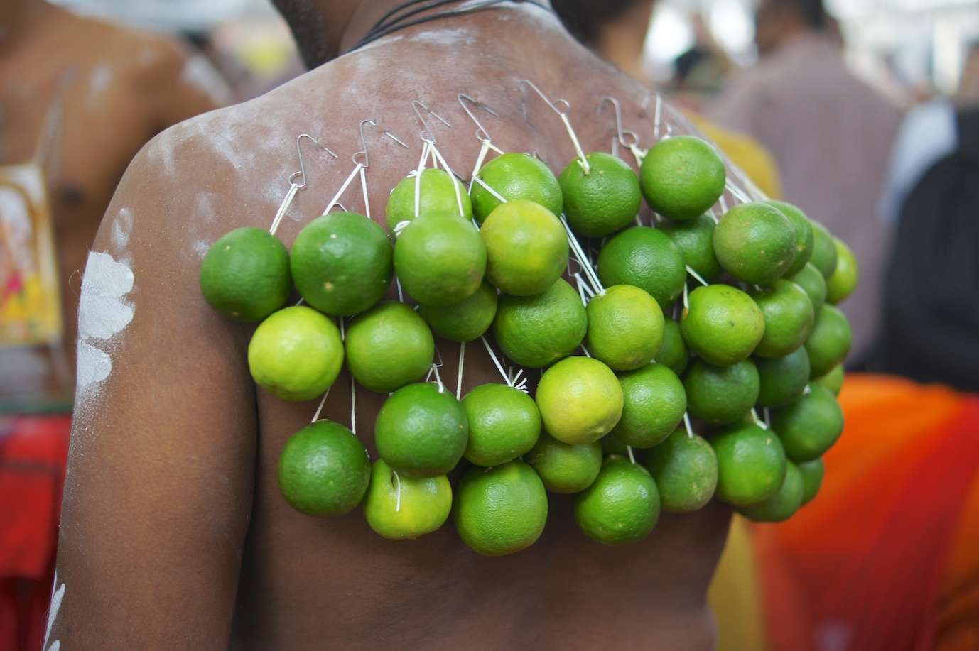 Limes, which are hung from hooks on the devotee backs, represent protection by the deities.