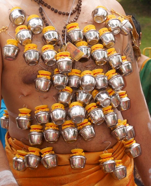 Other devotees fulfill their vows by carrying Paal Kudam (milk pots), which or represents the burden they are carrying either for themselves or their family. In the end, the milk is given to the temple as an offering.