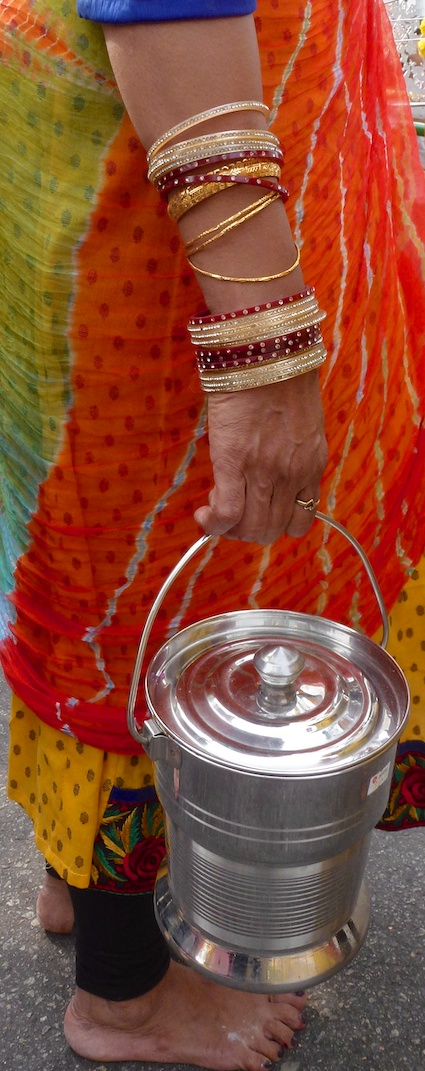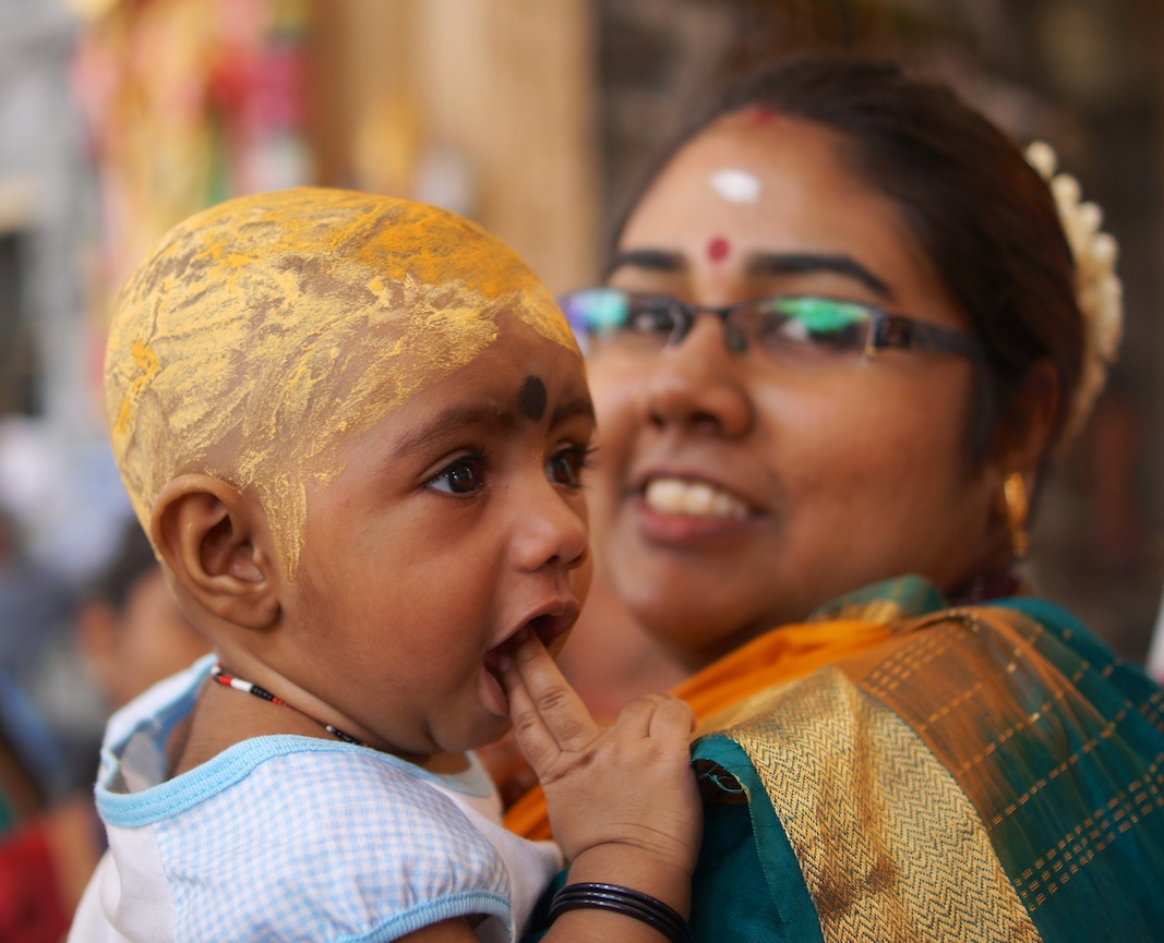 Many devotes, especially families, will each carry a pot of milk on their head to show devotion and love to the god. Most hold them up with both hands and they never put their arm down for a rest. This young girl was behind us in the procession and she kept her eyes closed the entire time.