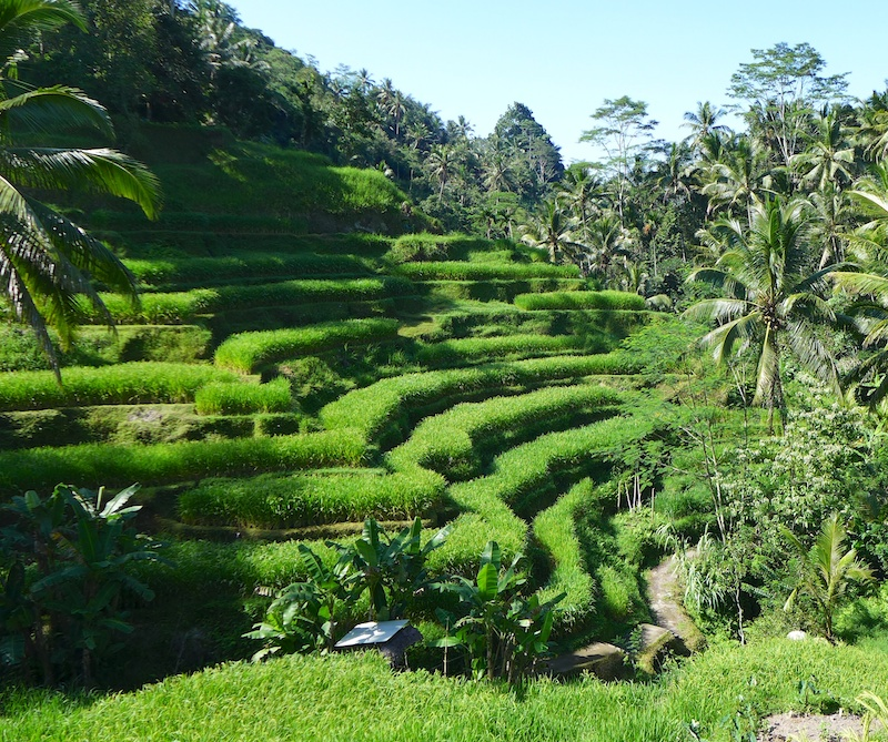 Bali has many working rice fields. Tegalalang in Ubud is one of the most striking ones due to its sloped terraces. You are able to walk along the ridges.